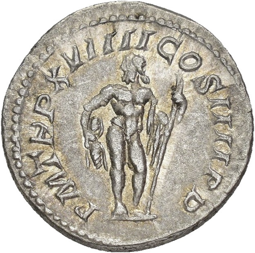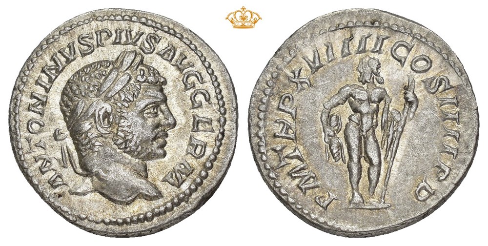 Caracalla 198-217 AD. AR Denarius (19 mm; 3.18 g). Rome mint, struck 216 AD. Obverse: ANTONINVS PIVS AVG GERM, Laureate head of Caracalla right. Reverse: P M TR P XVIIII COS IIII P P, Jupiter standing facing, head left, holding thunderbolt in right hand and long vertical scepter in left. Well struck and attractively toned.