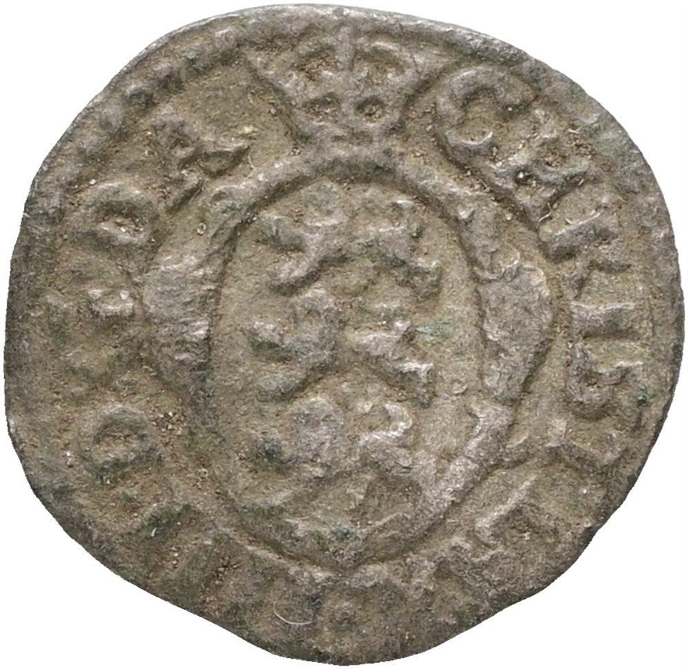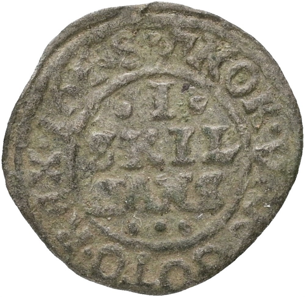 Skilling 1648, København. 0,63 g. Varianten uten kors. Schou 53. Sieg 27.3. Korrodert.