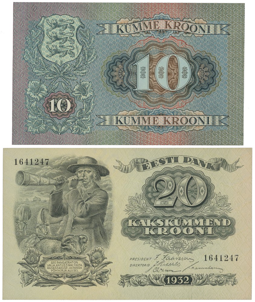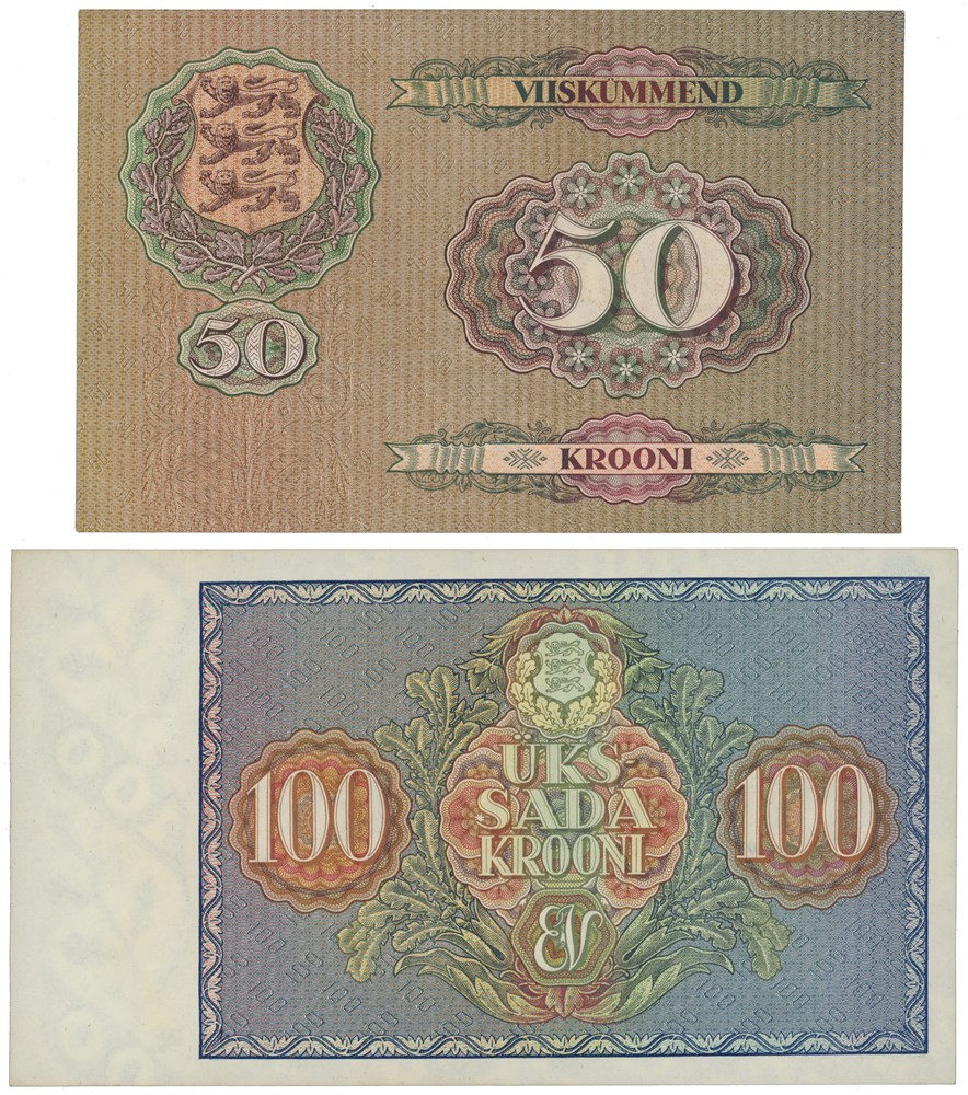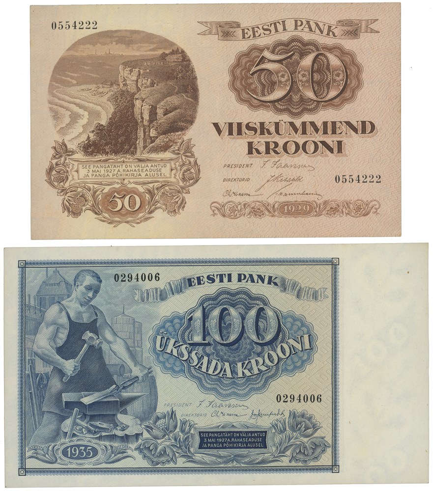 - Lot 4 pcs. 100 krooni 1935, 50 krooni 1929, 20 krooni 1932 and 10 krooni 1937. (15246435)