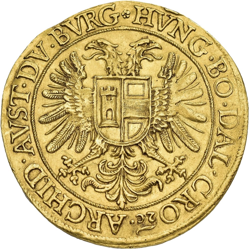 This rare, interesting and impressive 'Three Emperors-type' with Maximilian I, Charles V, and Ferdinand I are probably struck during the reign of Matthias II, who was Holy Roman Emperor 1612-1619, Archduke of Austria 1608-1619, King of Hungary and Croatia 1608-1618, and King of Bohemia 1611-1617. He was not a strong ruler and the Bohemian Revolt that led to the Thirty Years' War took off in the final years of his reign.