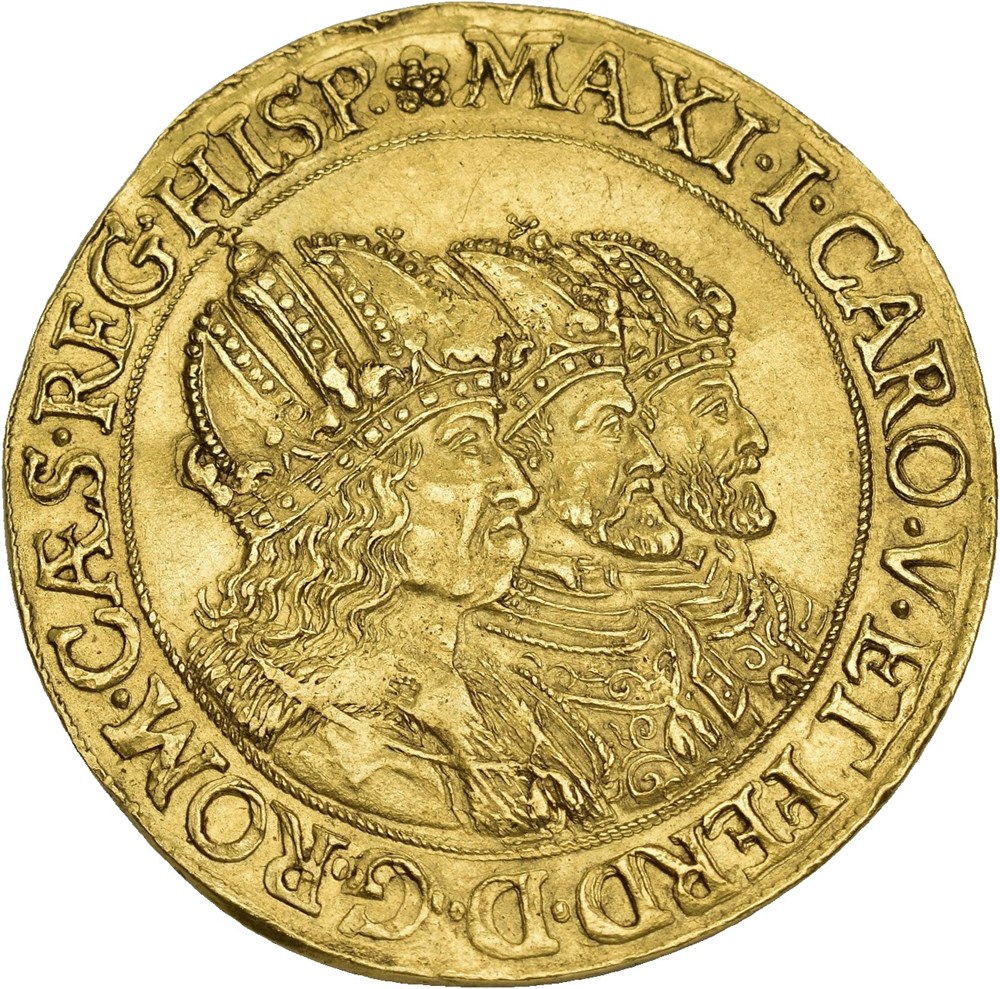 This rare, interesting and impressive 'Three Emperors-type' with Maximilian I, Charles V, and Ferdinand I are probably struck during the reign of Matthias II, who was Holy Roman Emperor 1612-1619, Archduke of Austria 1608-1619, King of Hungary and Croatia 1608-1618, and King of Bohemia 1611-1617. He was not a strong ruler and the Bohemian Revolt that led to the Thirty Years' War took off in the final years of his reign.