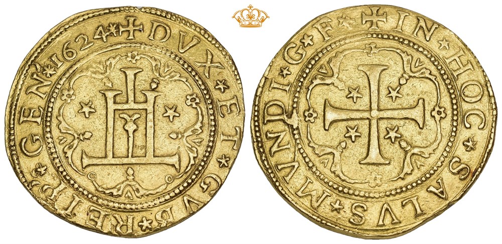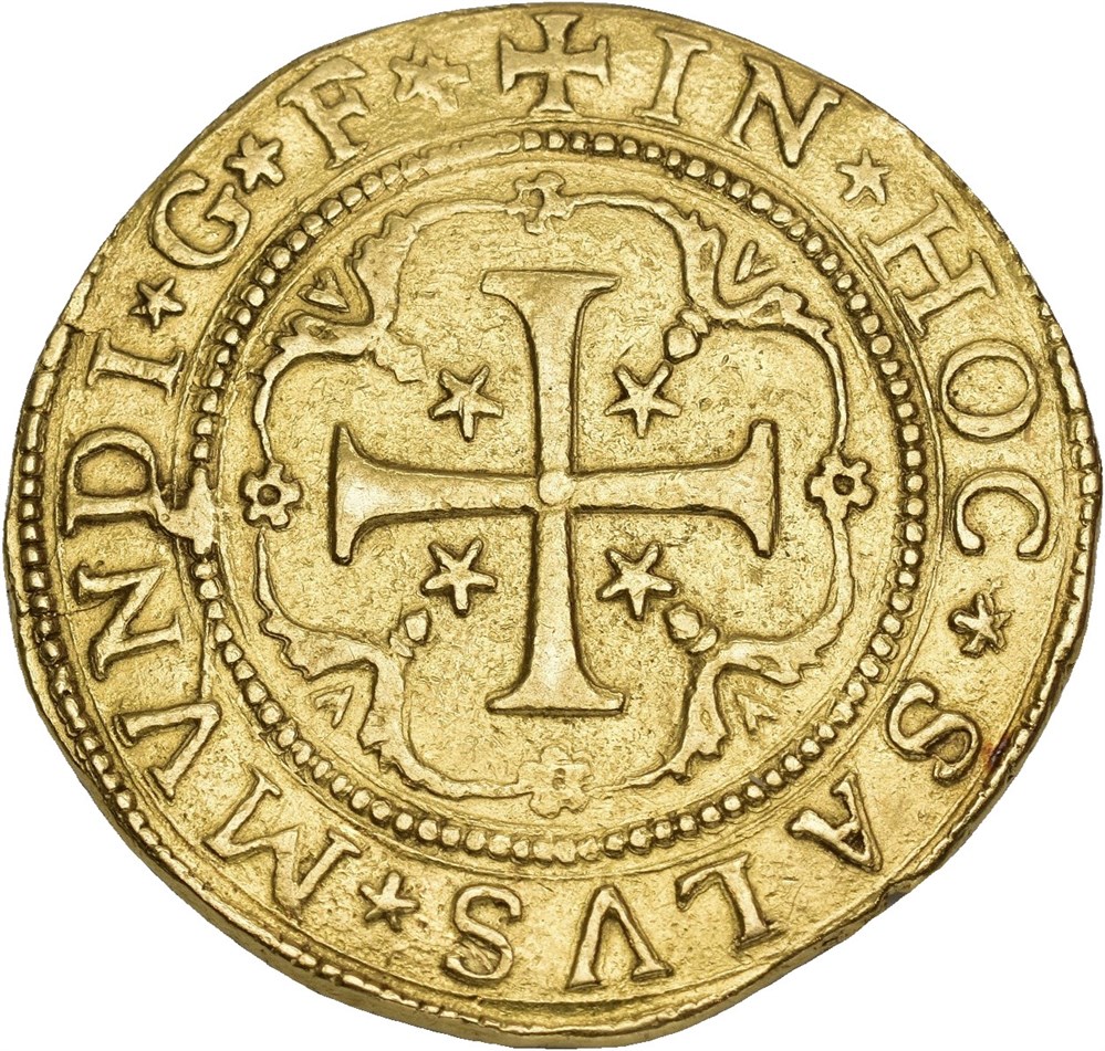 Genoa's coins bore the same images over centuries: a city gate on the obverse and a cross on the reverse. The reverse legend on this magnificent coin is atypical for Genoa as it is one of the few pieces bearing the inscription "IN HOC SALVS MVNDI". The reverse legends of the Republic's coins usually referred to Conrad III, King of the Holy Roman Empire, who had granted Genoa the right to mint coins in 1139. The cross on the reverse was probably the cross of Jerusalem and a reference to Conrad, who had participated in the Second Crusade.