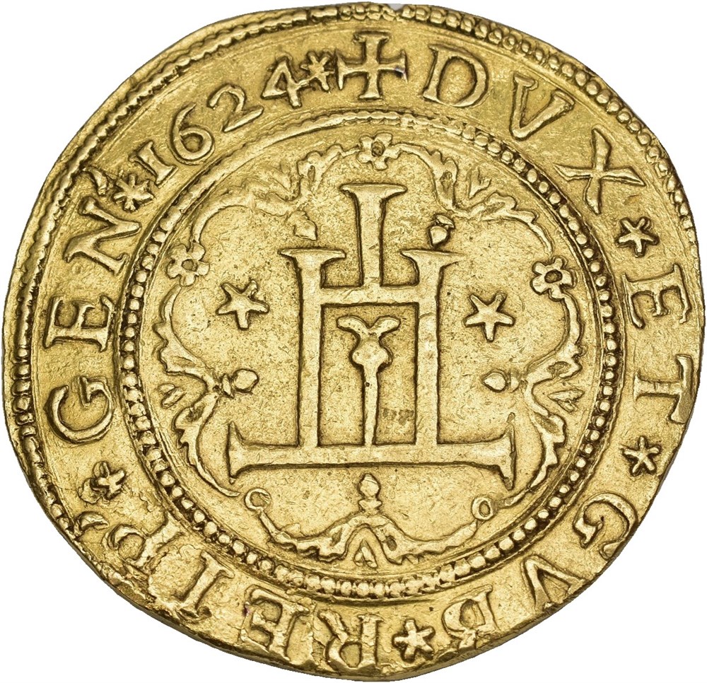 10 Scudi 1624, Genoa. 32.15 g. Minor clipping. The only specimen known in private hands.