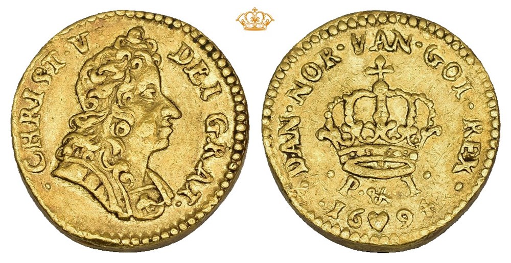 2 dukat 1694, København. 6,92 g. Av største sjeldenhet i privat eie.
