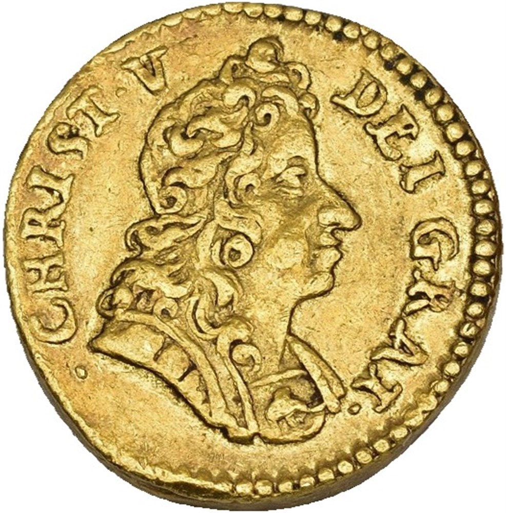 2 dukat 1694, København. 6,92 g. Av største sjeldenhet i privat eie.