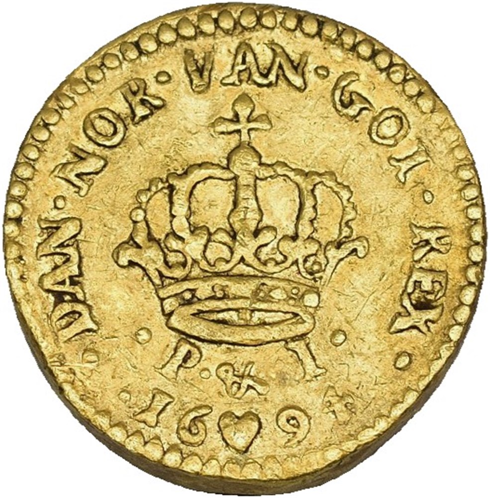 2 dukat 1694, København. 6,92 g. Av største sjeldenhet i privat eie.