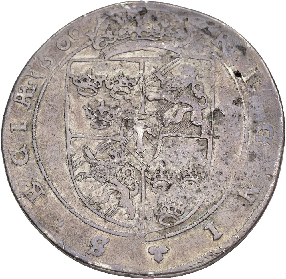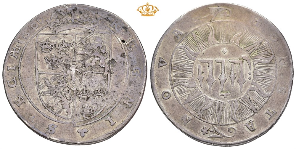 Daler 1600, Stockholm. 27,90 g. Hakket rand, lite hull og noe korrodert. En sjelden ettårstype. Denne mynten har tidligere vært utstilt ved Kungliga Myntkabinettet i Sverige.