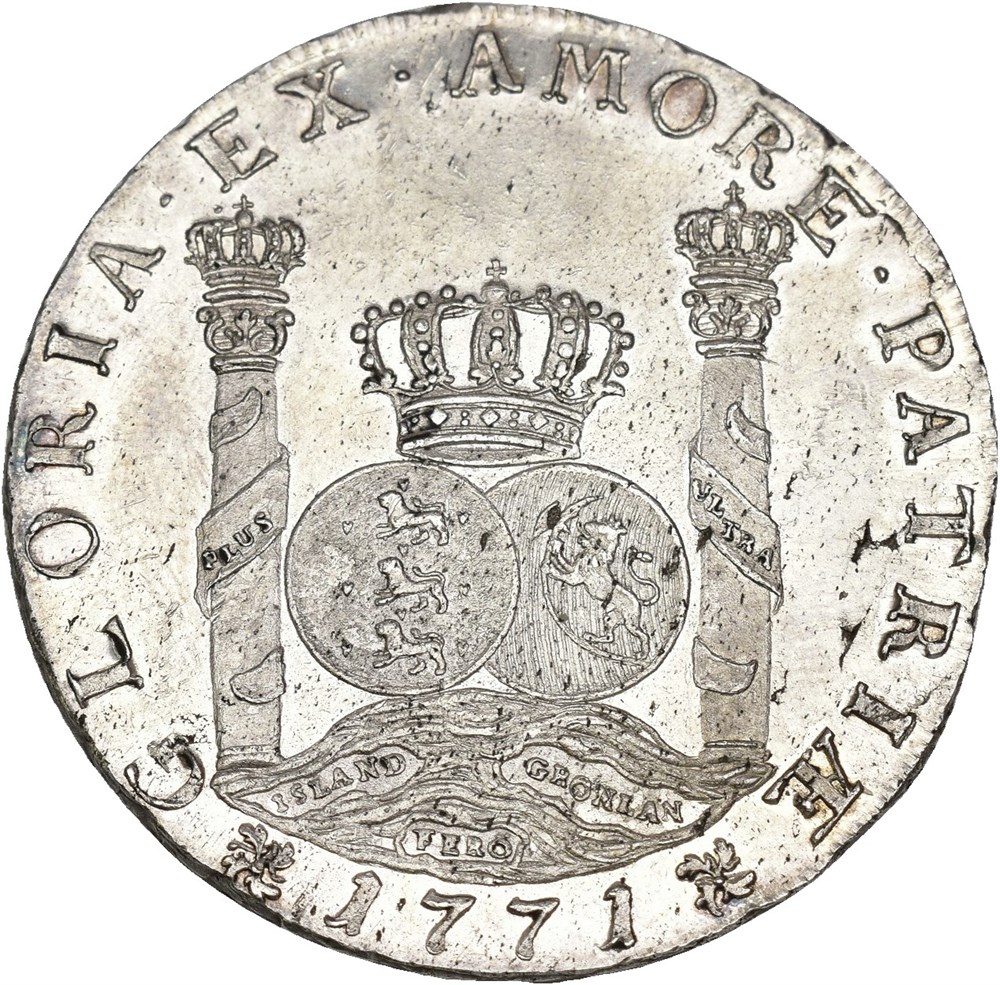 Piaster 1771 (preget i 1774), København. 27,00 g. Et utsøkt prakteksemplar av denne meget sjeldne ettårs-typen, som regnes som en av dansk numismatikk sine mest ikoniske rariteter, med stor internasjonal etterspørsel – der den er kjent som «The Greenland Pillar Dollar».