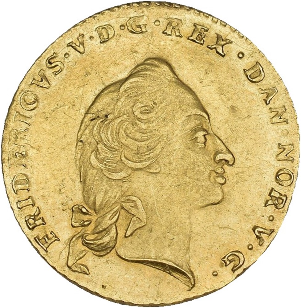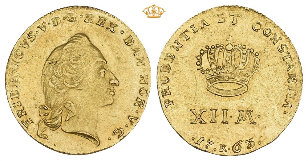 Kurantdukat / 12 mark 1763 A/K, København. 3,08 g. Pent eksemplar av denne sjeldne typen med Arbiens portrett.
