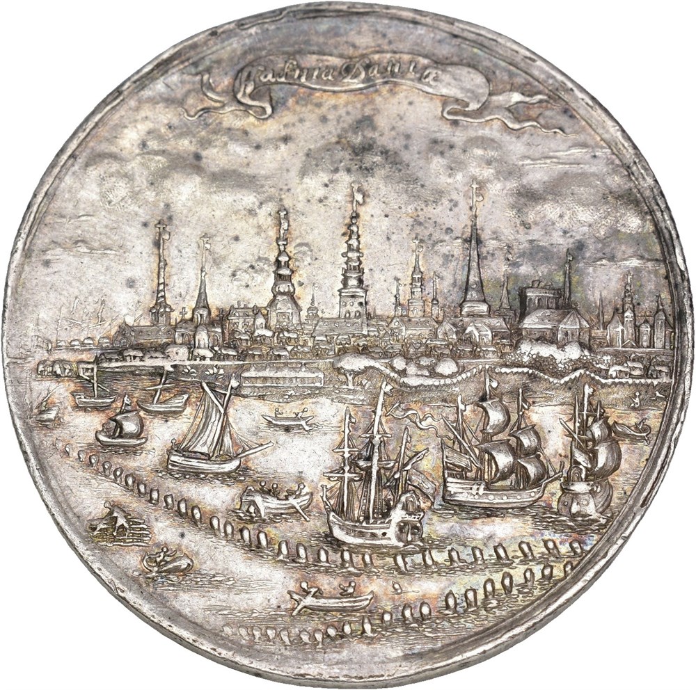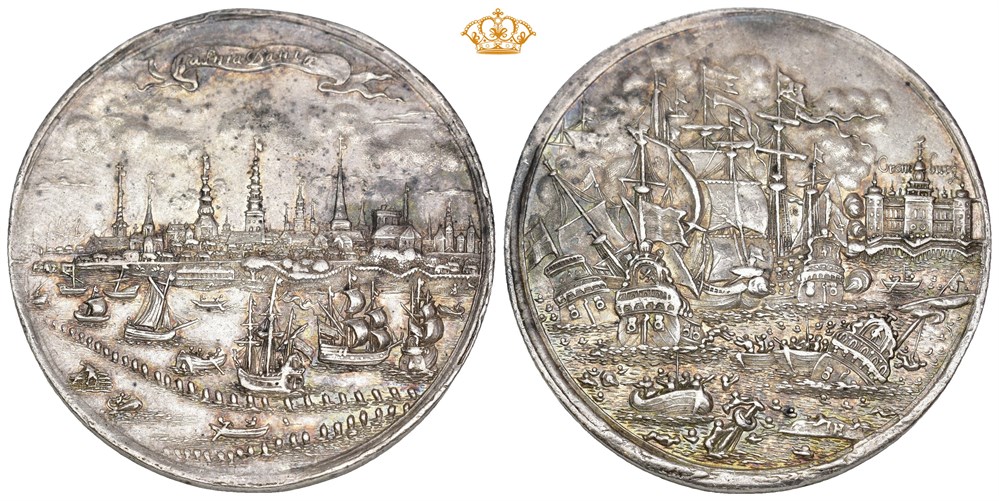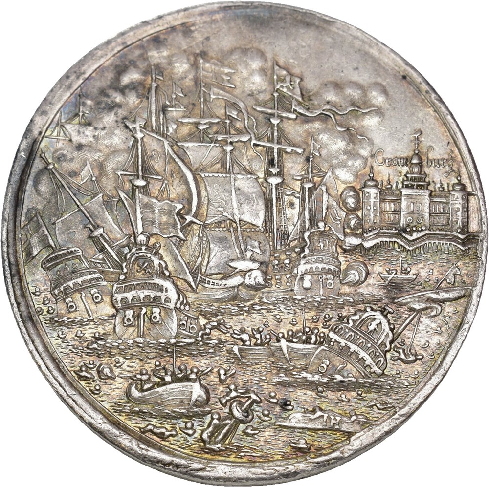 Slaget ved Kronborg, u. år. Varianten med innskriften Croneburg" ved slottet. Jeremias Hercules. Sølv 47 mm, 33,21 g. Nydelig patinert eksemplar med fine detaljer.