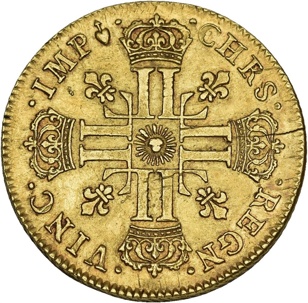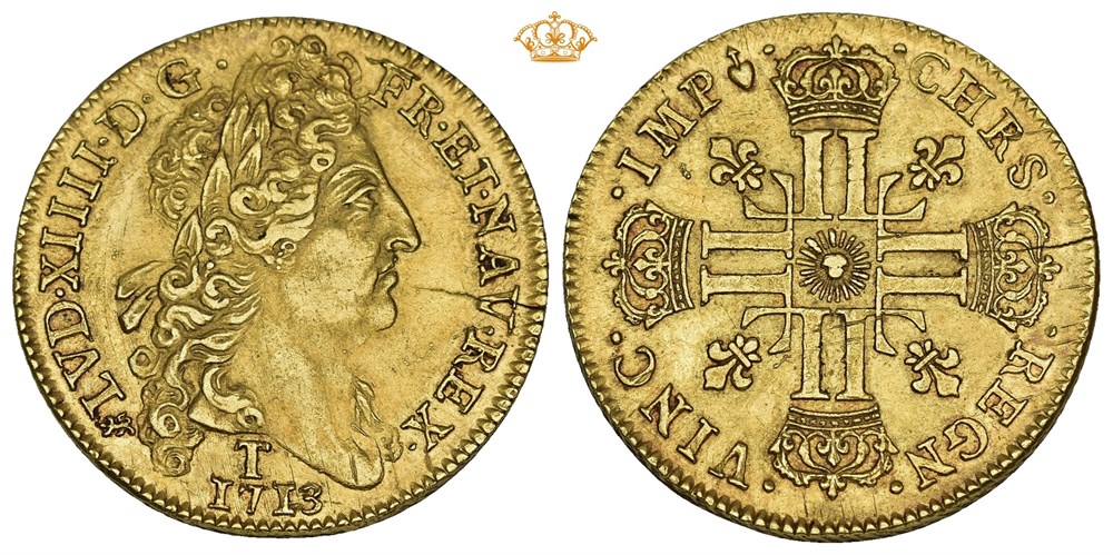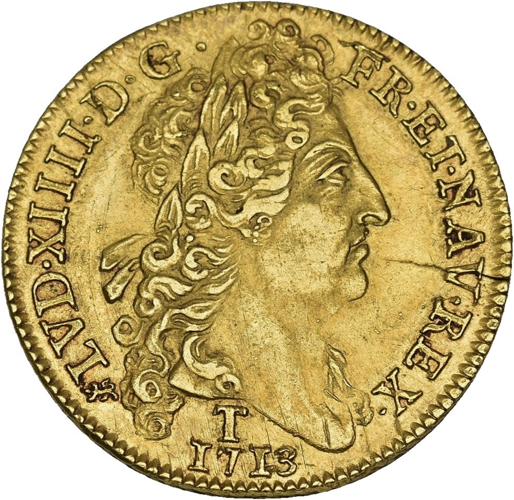 2 Louis d'or 1713 T, Nantes.16,25 g. Crack in planchet. Very rare.