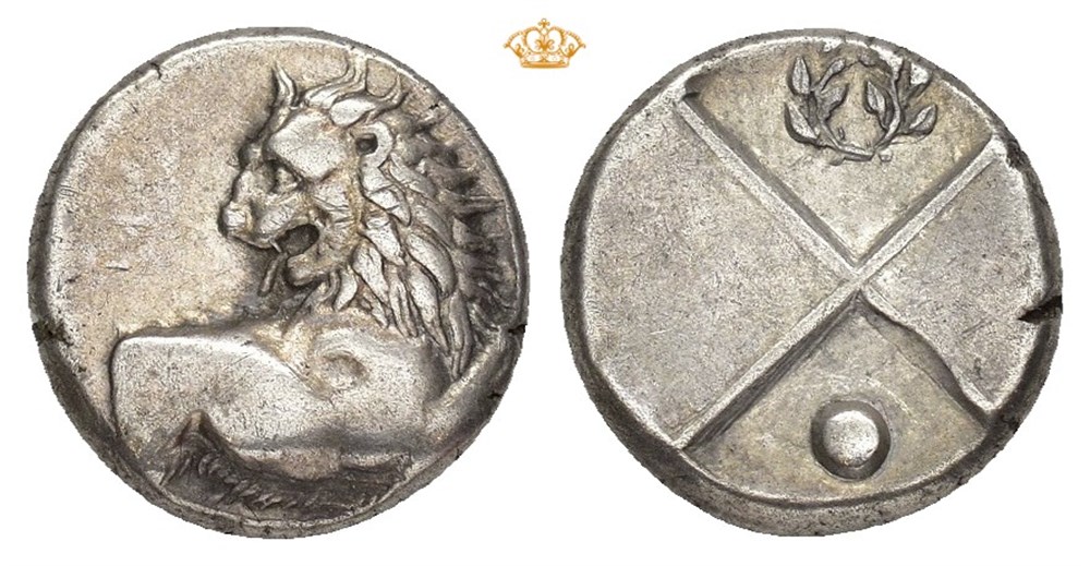 THRACE, Chersonesos. Circa 386-338 BC. AR hemidrachm (10.5 mm; 2.30 g). Obverse: Forepart of lion right, head reverted / Reverse: Quadripartite incuse square with alternating raised and sunken quarters; pellet in one sunken quarter and wreath in the opposite sunken quarter. Well struck and attractively toned.