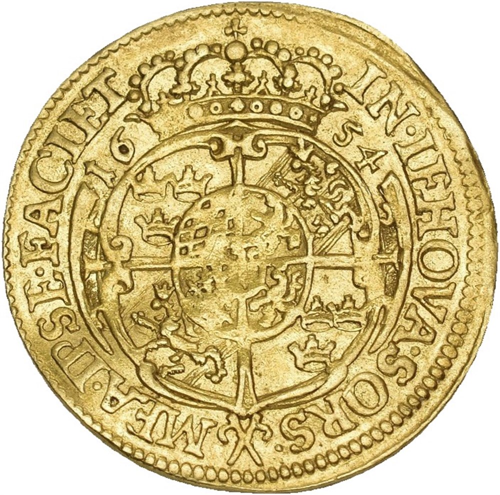 Dukat 1654, Stockholm. 3,45 g. Buklet. RR. Den første dukaten preget i Sverige.