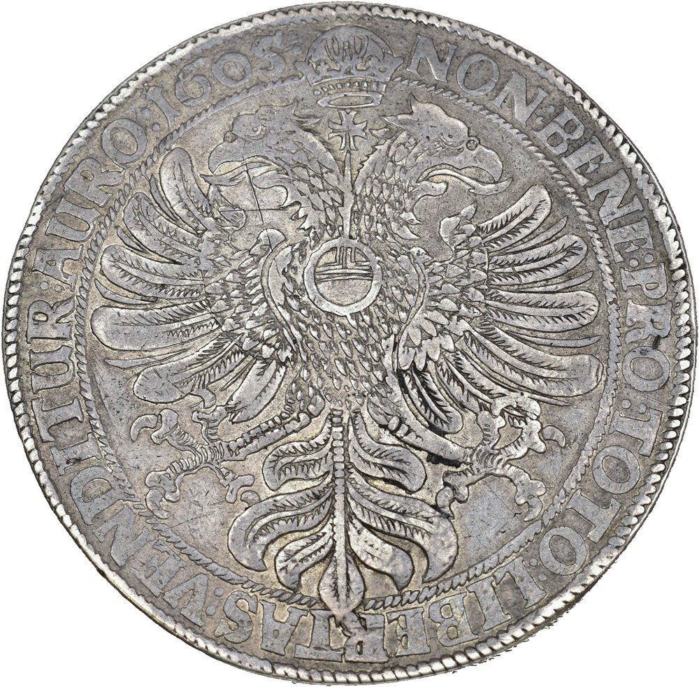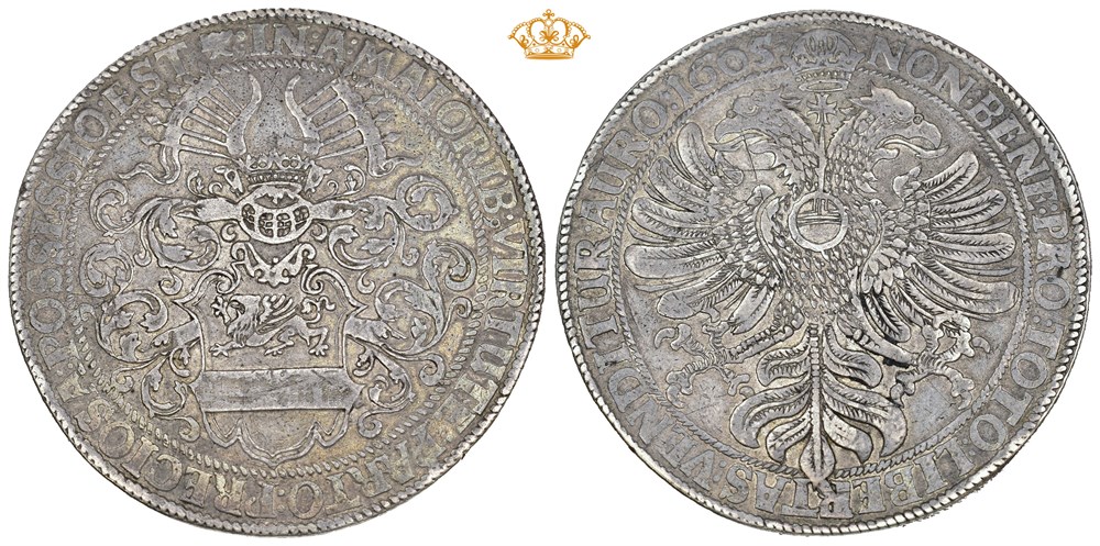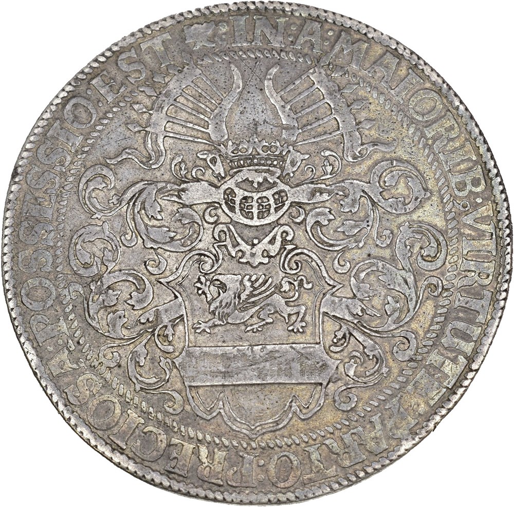 4 Reichstaler 1605, Rostock. 116.43 g. IN A MAIORIB 9 VIRTUTE PARTO PRECIOSA POSSESSIO EST (Mint master's mark of Joachim Köneke) / NON BENE PRO TOTO LIBERTAS VENDITUR AURO 1605.