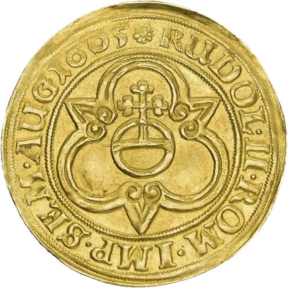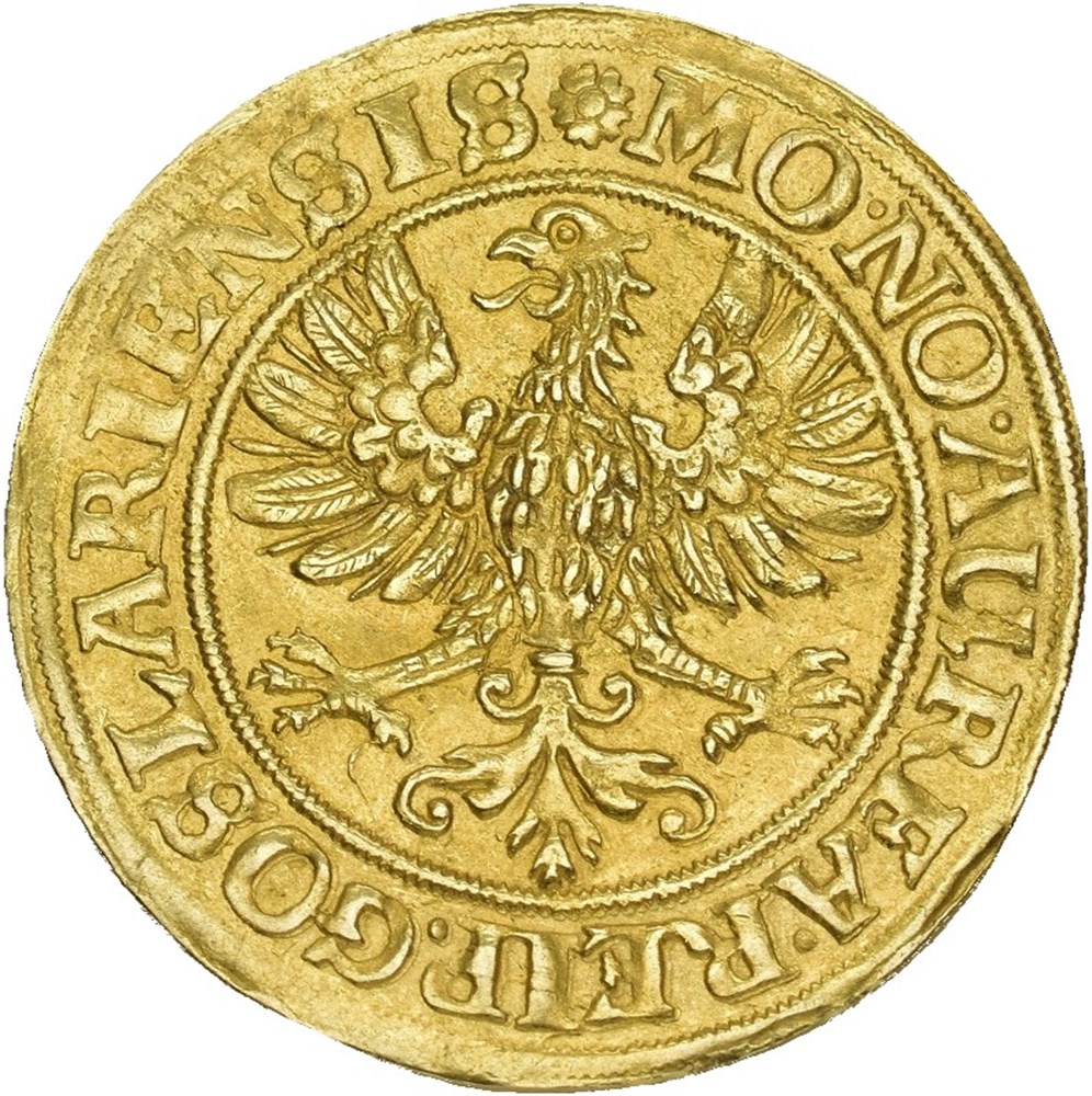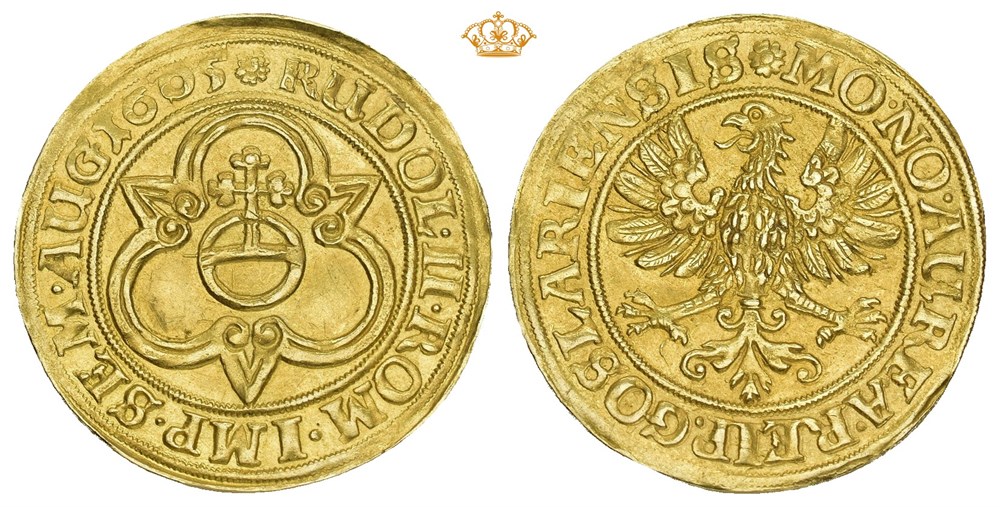 Gulden 1605, Goslar. 3.22 g. MON NO AUREA REIP GOSLARIENSIS / RUDOL II ROM IMP SEM AUG 1605. Very little bending. The first gold gulden from Goslar. Excessively rare.