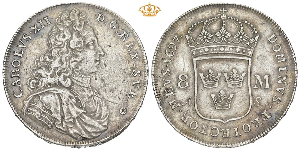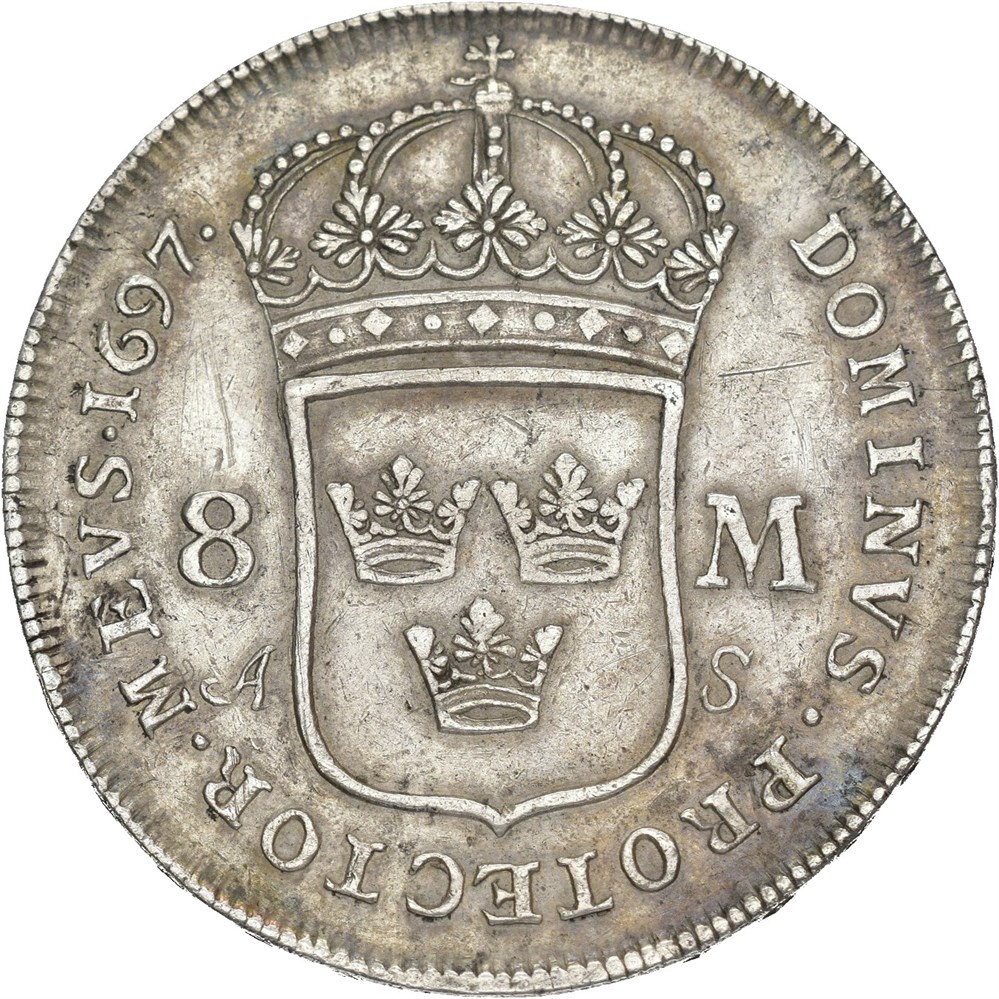 8 Mark 1697, Stockholm. 30,63 g. Riper.
