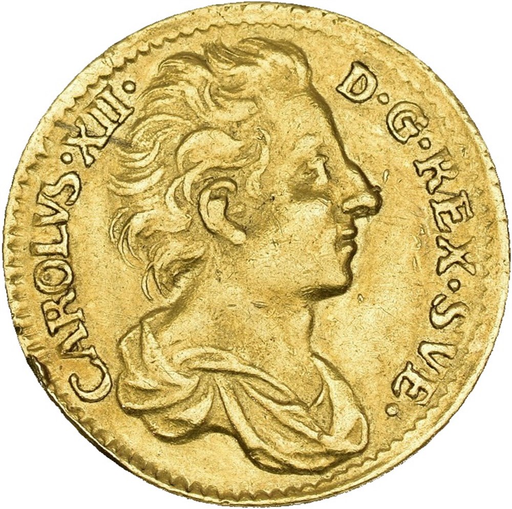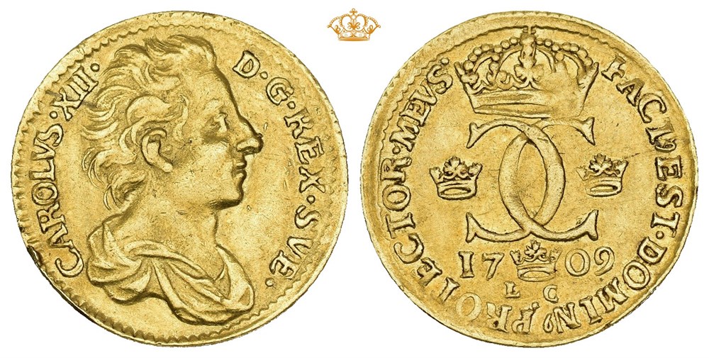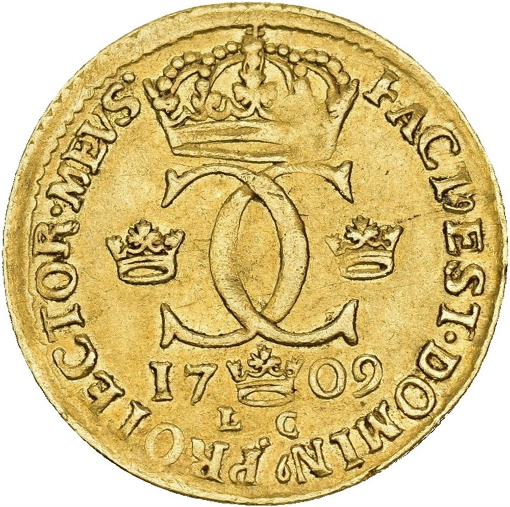 Dukat 1709, Stockholm. 3,48 g. Kanthakk, svakt buklet.