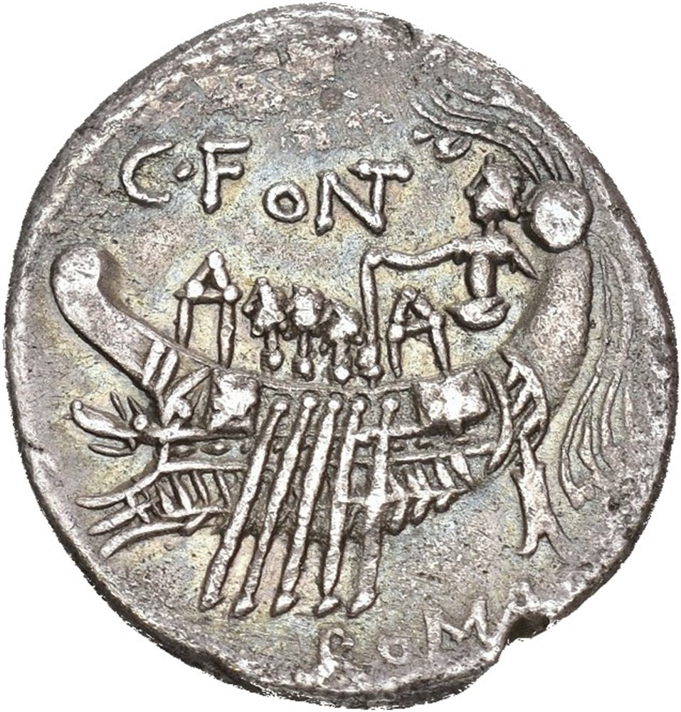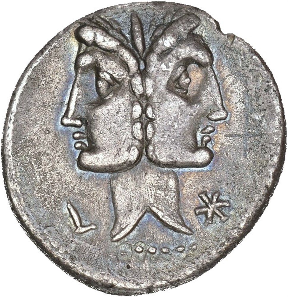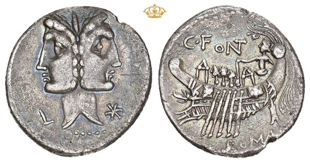 C. Fontetius, 114-113 BC. AR Denarius (20 mm; 3.85 g). Rome mint. Obverse: Laureate Janiform head of the Dioscuri; L (control letter) lower left and star (mark of value) to lower right. Reverse: C•FO NT - ROMA, Galley manned by a steersman and three oarsmen, facing left. Edge chip and weak grafitti "X" on obverse. Attractive iridescent cabinet toning.