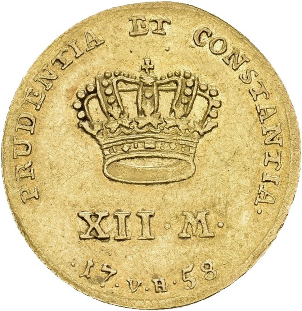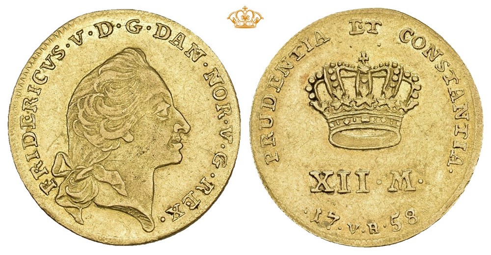 12 mark / kurantdukat 1758, København. 3,09 g.