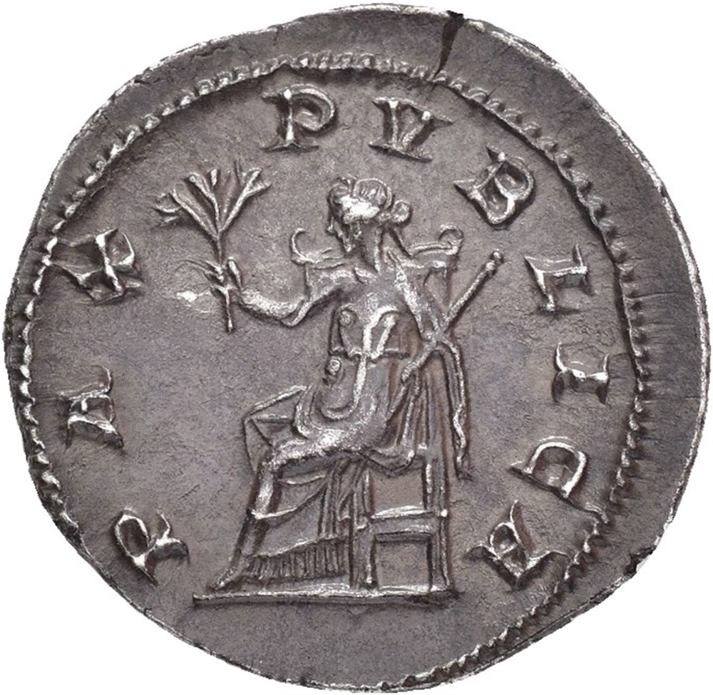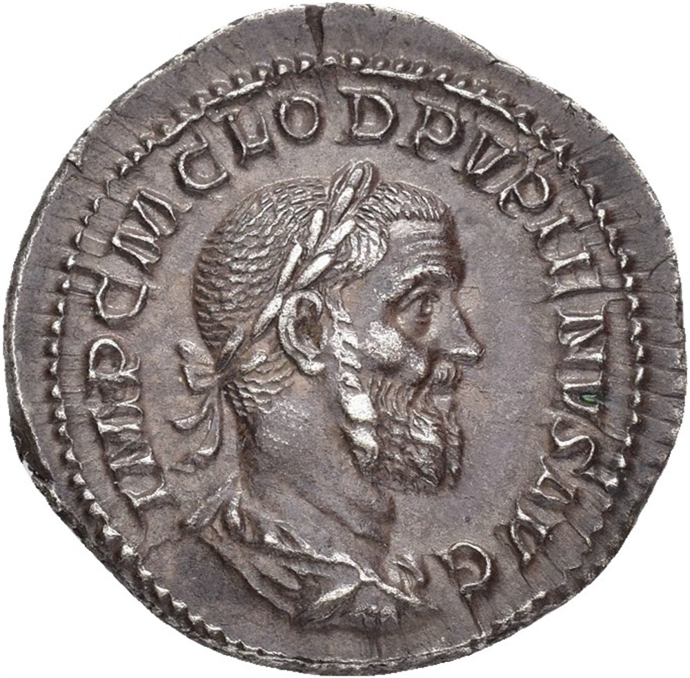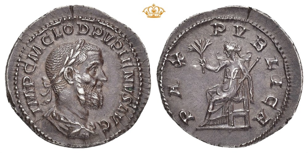 Pupienus 238 AD. AR Denarius (21 mm; 2.68 g). Rome mint. Obverse: IMP C M CLOD PVPIENVS AVG, Laureate, draped and cuirassed bust of Pupienus right. Reverse: PAX PVBLICA, Pax seated left, holding a branch in her extended right hand and a scepter in left. Well struck. Dark patina.