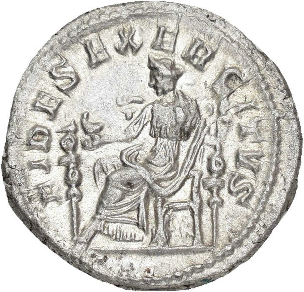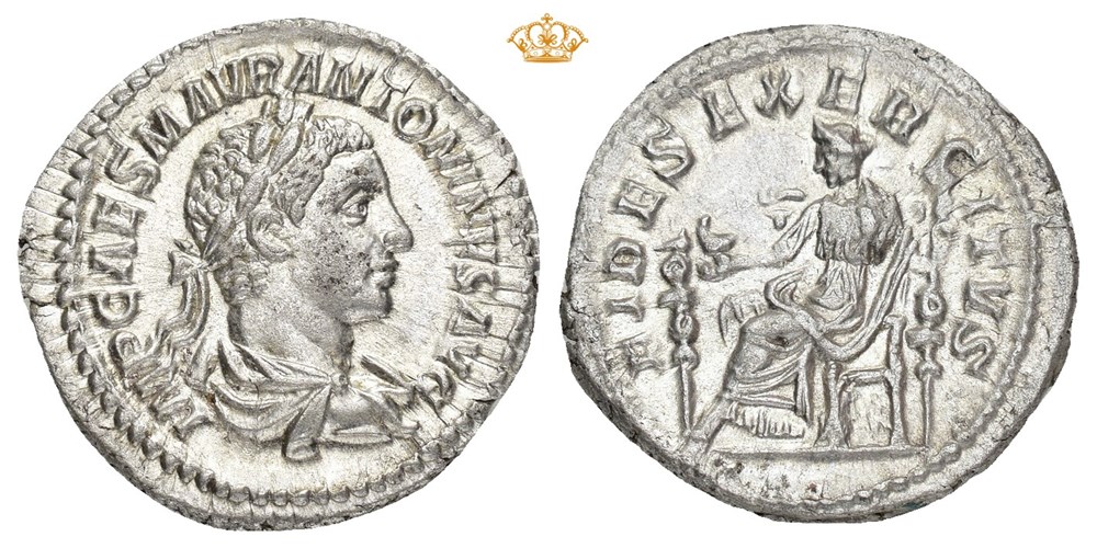 Elagabalus 218-222 AD. AR Denarius (20 mm; 3.02 g). Rome mint, struck 218 AD. Obverse: IMP CAES M AVR ANTONINVS AVG, Laureate, draped and cuirassed bust of Elagabalus right. Reverse: FIDES EXERCITVS, Fides seated left, holding an eagle in her right hand and a standard in left, a second standard before her. Lustrous and lightly toned.