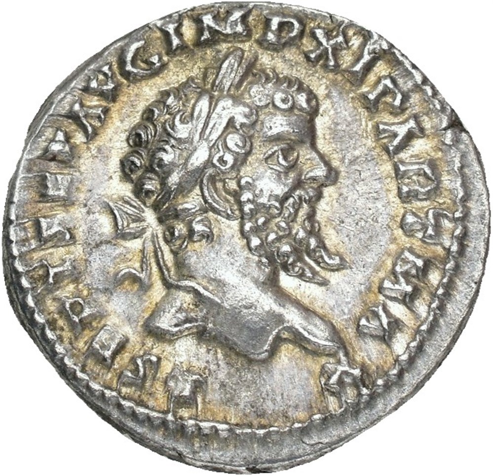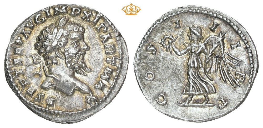 Septimius Severus 193-211 AD. AR Denarius (19 mm; 3.43 g). Laodicea ad Mare mint, struck circa 198-202 AD. Obverse: L SEPT SEV AVG IMP XI PART MAX, Laureate head of Septimius Severus right. Reverse: COS III P P, Victory advancing left, holding a wreath in her extended right hand and a palm branch over left shoulder. Well struck, lustrous, and attractively toned.