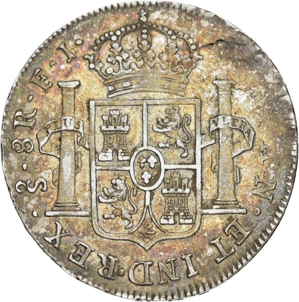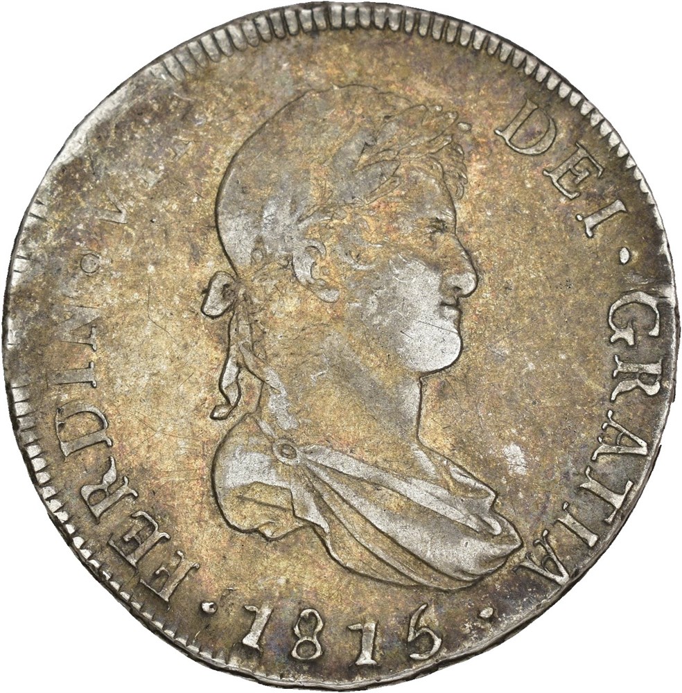 8 Reales 1815 F J, Santiago. 26,91 g. Planchet flaw and weak strike at 11 o’clock on the obverse, with corresponding weakness on the reverse. Beautiful patina.