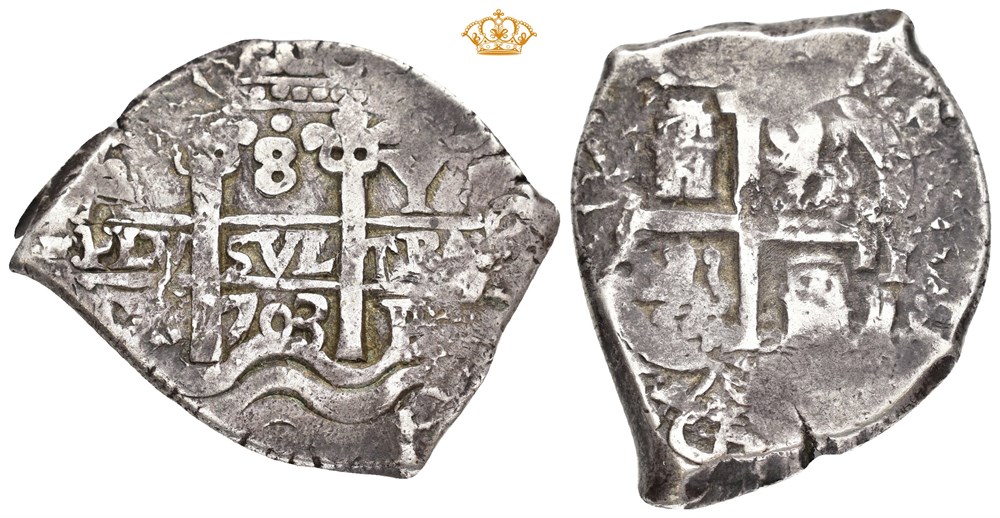 Cob 8 Reales 1703, Potosi. 26.49 g, Diego de Ybarbouru (Y).