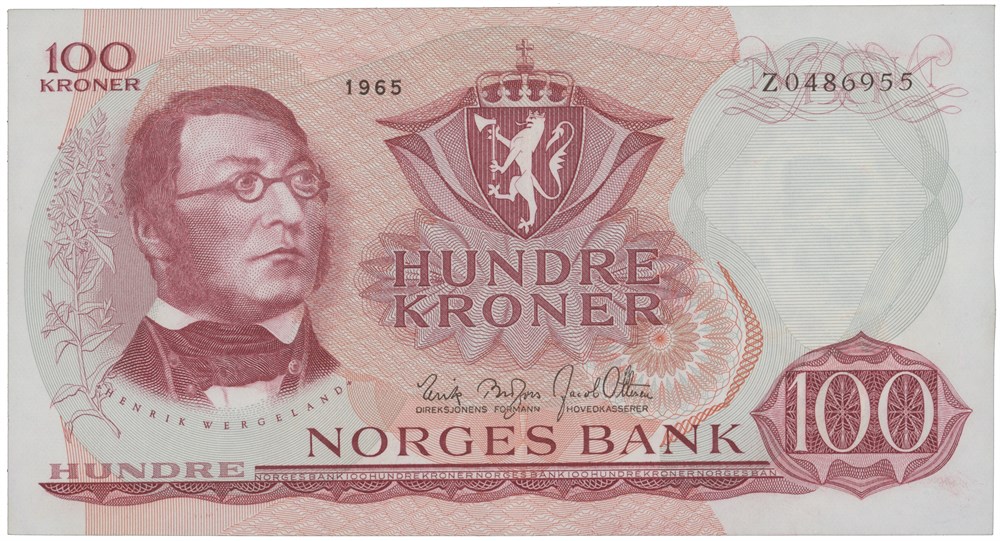 100 kroner 1965. Z0486955. Signert Brofoss/Ottesen. Erstatningsseddel/replacement note (0-million). Uvanlig/uncommon.
