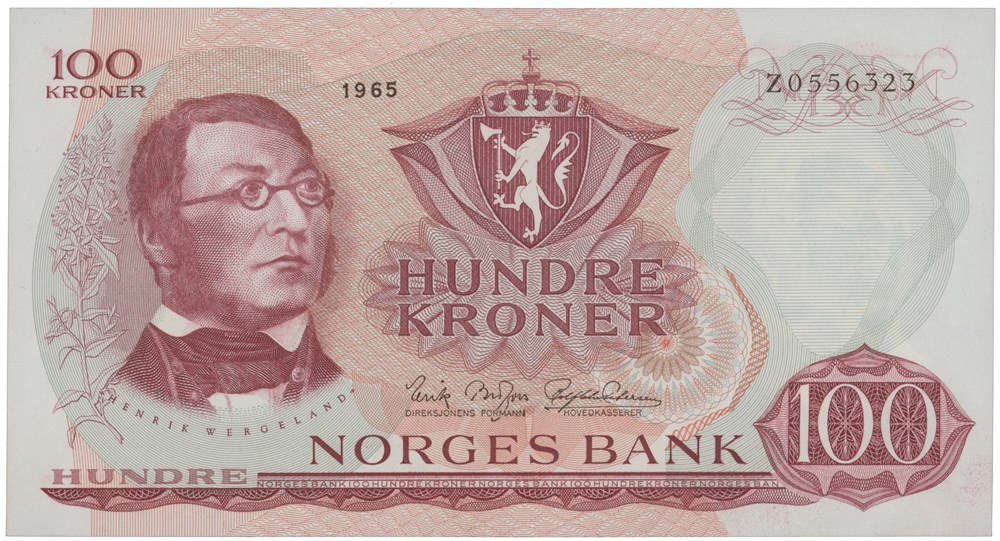 100 kroner 1965. Z0556323. Signert Brofoss/Petersen. Erstatningsseddel/replacement note (0-million).