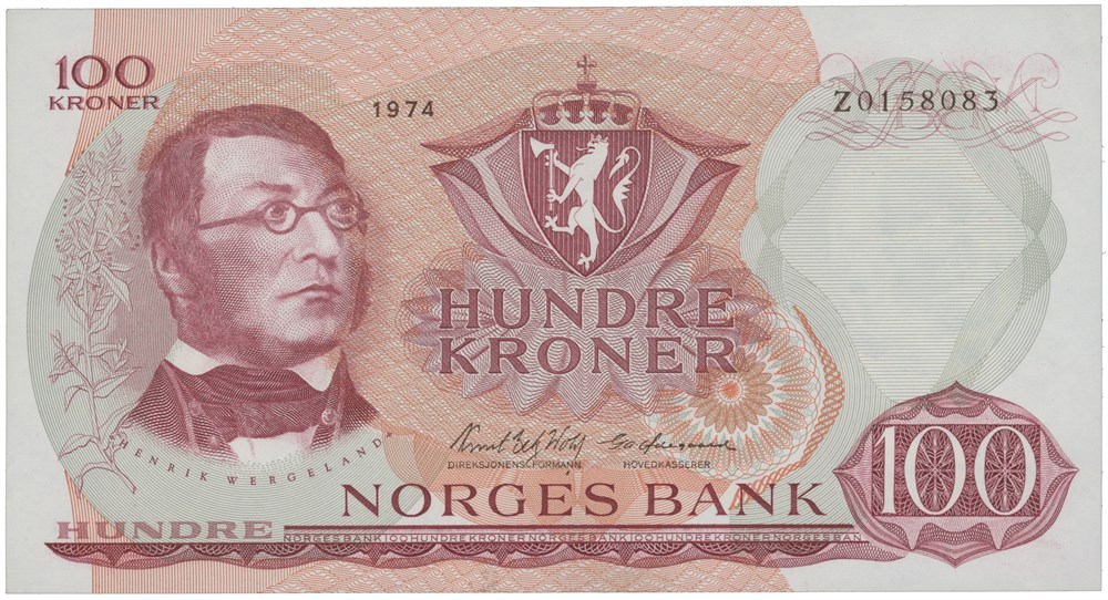 100 kroner 1974. Z0158083. Erstatningsseddel/replacement note.