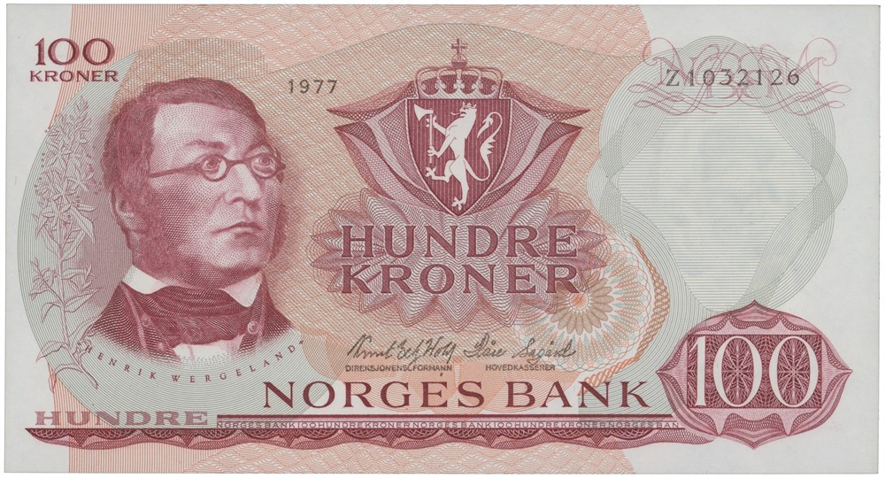 100 kroner 1977. Z1032126. Erstatningsseddel/replacement note (1-million).