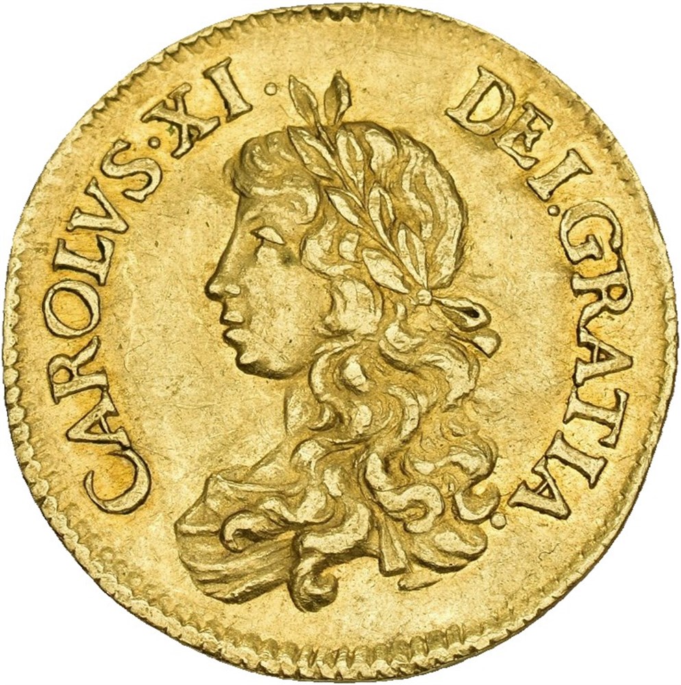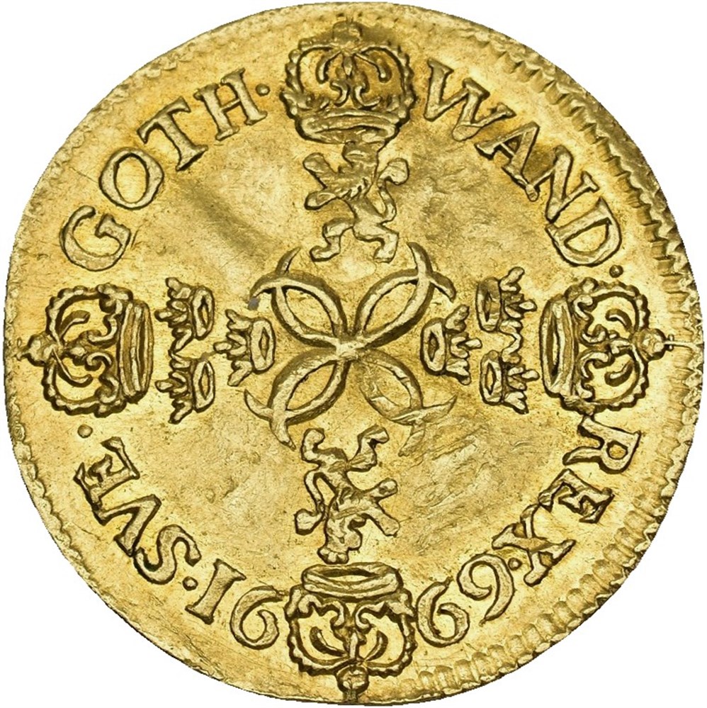 Dukat 1669, Stockholm. 3,49 g. Riper, buklet, testmerke i randen.