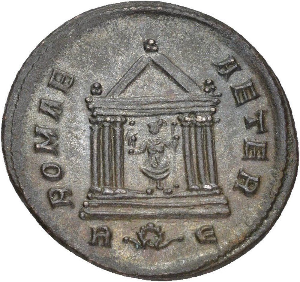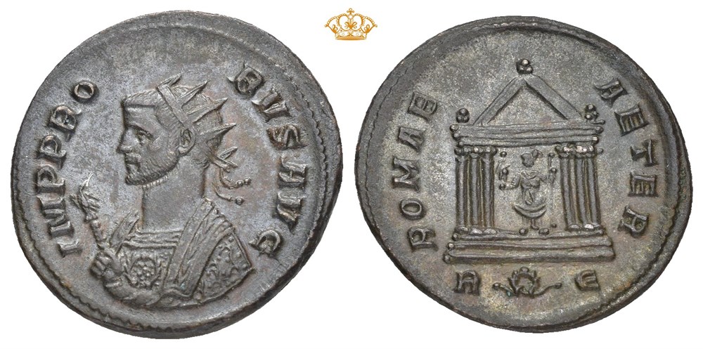 Probus 276-282 AD. BI Antoninianus (20 mm; 4.22 g). Rome mint, struck 279 AD. Obverse: IMP PROBVS AVG, Bust of Probus facing left, wearing the imperial mantle and holding a scepter surmounted by an eagle in his right hand. Reverse: ROMAE AETER, hexastyle temple; in centre, Roma seated, holding Victory in her right hand and a scepter in her left; wreath between R and Є in exergue. Sharply struck with fine details.