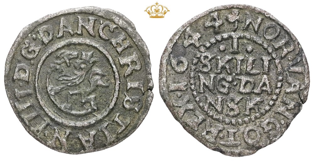 1 skilling 1644 (0,84 g). S.151. Lett korrodert/slightly corroded. Kantskader/edge damages.