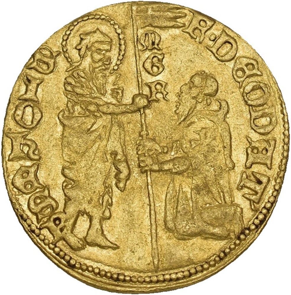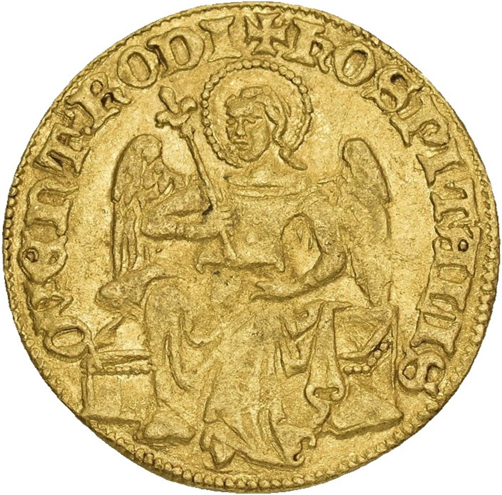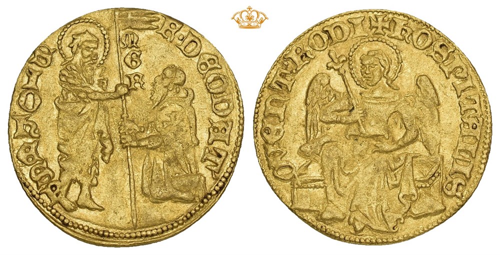 The Knights of St. John of Jerusalem at Rhodes / Knights Hospitaller. Crusaders. Dieudonné de Gozon 1346-1353, Grand Master. Ducat ND, struck circa 1350-1353. 3.53 g. Obverse: F•DEODAT' MGR S IOhES B, The Grand Master, kneeling to the left and holding a staff bearing the flag of the Order, receives it from St. John the Baptist, nimbate and standing to the right. Reverse: +hOSPITALIS QVENT'RODI, An angel, nimbate and winged, seated facing forward on the open tomb of Christ, holding a scepter in his right hand. An exceptionally rare specimen, preserved in superb condition.