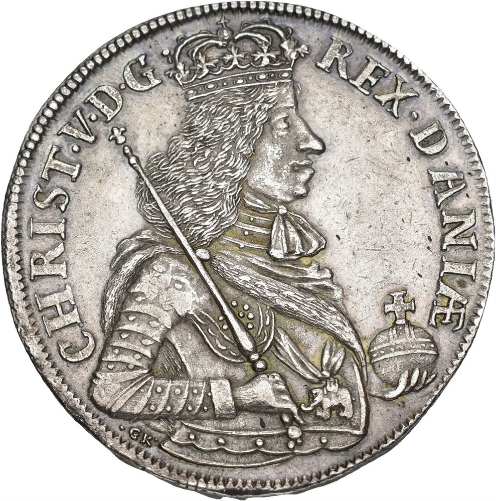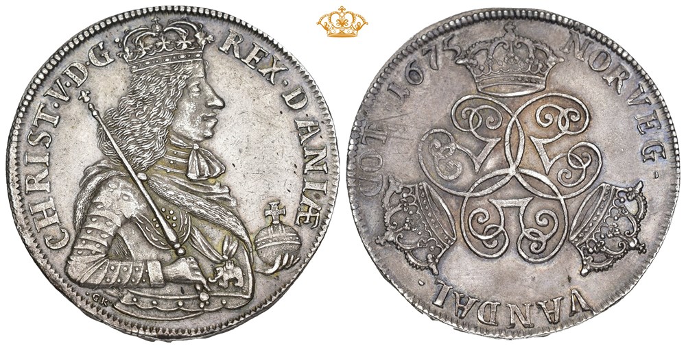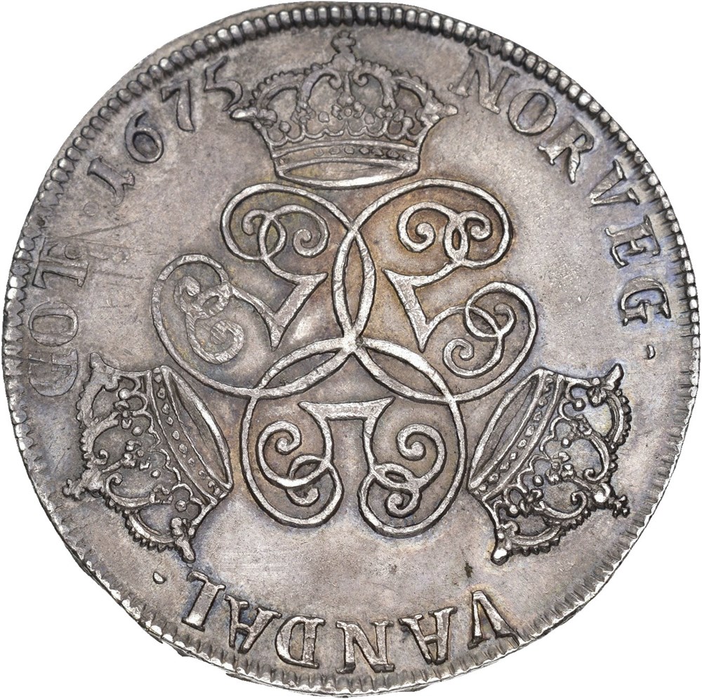 Speciedaler 1675, København. 28,90 g. Vakkert, patinert eksemplar av den såkalte Salvingsspecien.