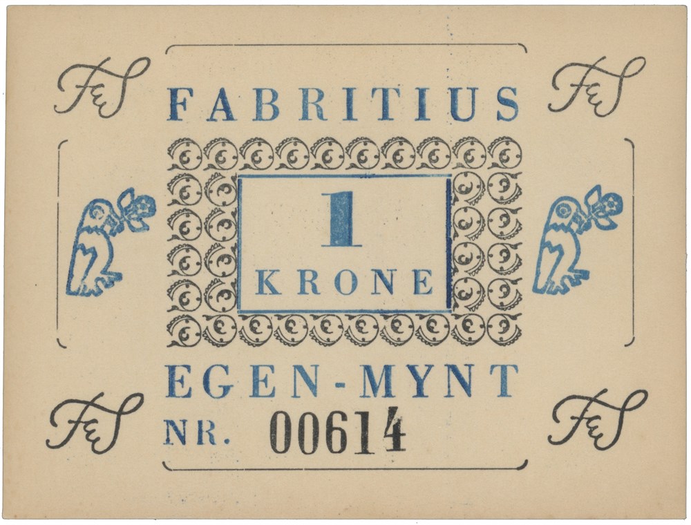 - Fabritius. 1 krone egen-mynt. Nr. 00614. (15423712)