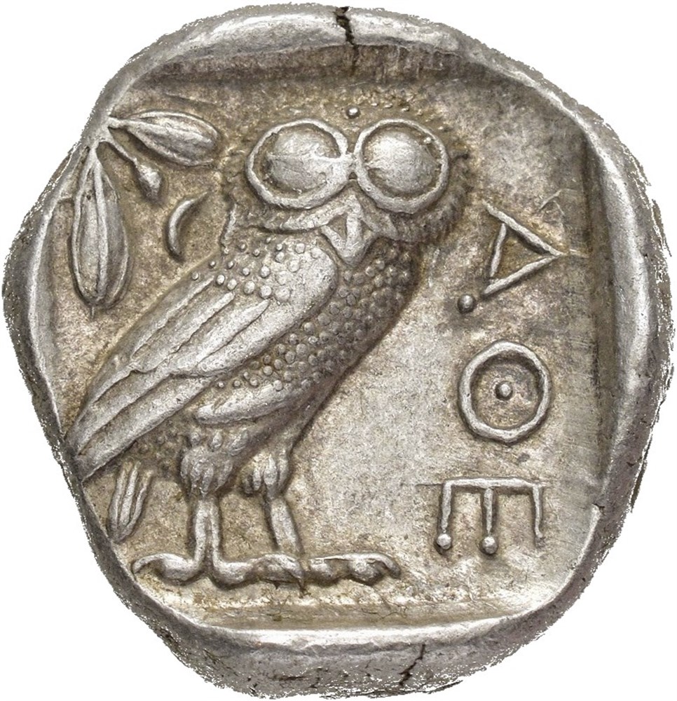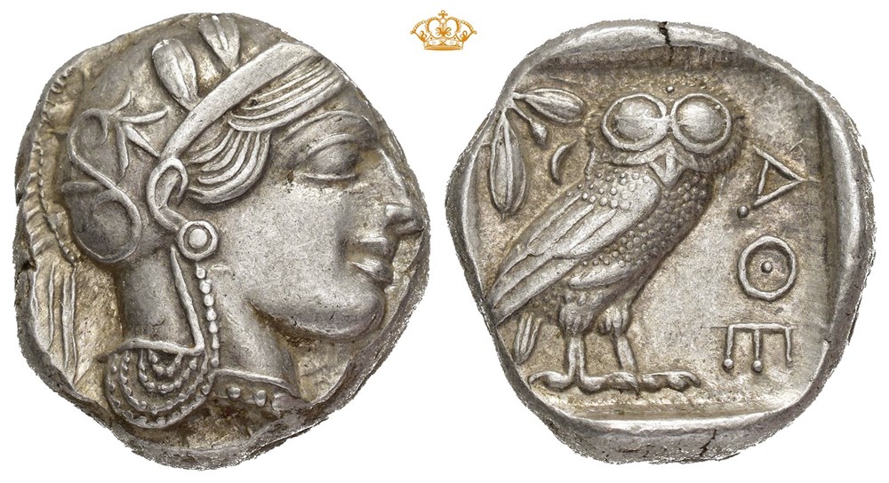 ATTICA, Athens. AR Tetradrachm (23 mm; 17.25 g). Struck circa 454-404 BC. Obverse: Head of Athena right with frontal eye, wearing crested and ornamented Attic helmet, earring and necklace. Reverse: ΑΘΕ, Owl standing right, head facing, closed tail feathers, olive sprig and crescent to left; all within incuse square. Light iridescent cabinet toning.