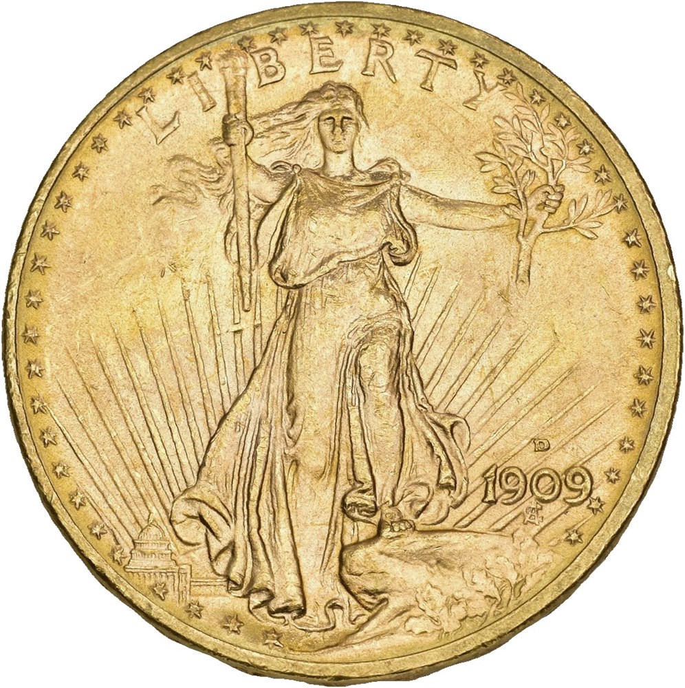 20 Dollars 1909 D, Denver. 33.51 g. Prev. in slab graded MS 63 by PCGS (21725352, PCGS ticket enclosed).