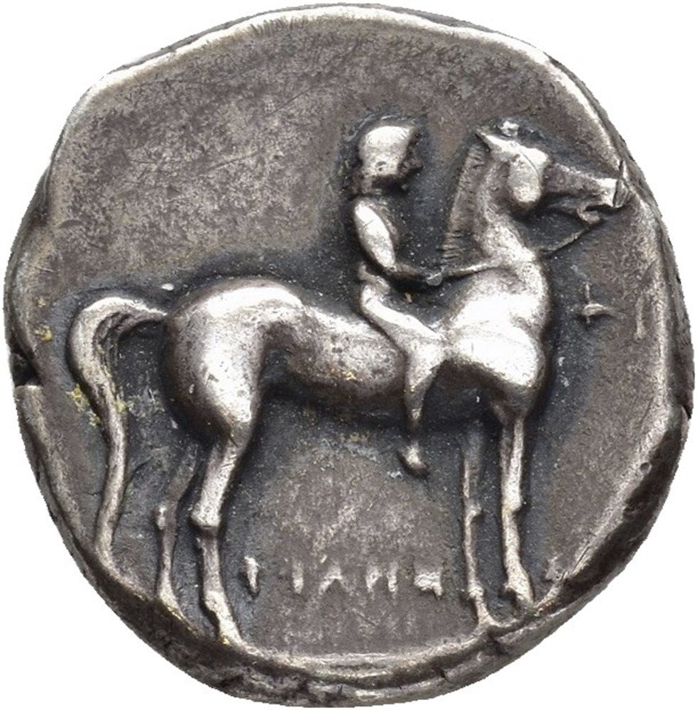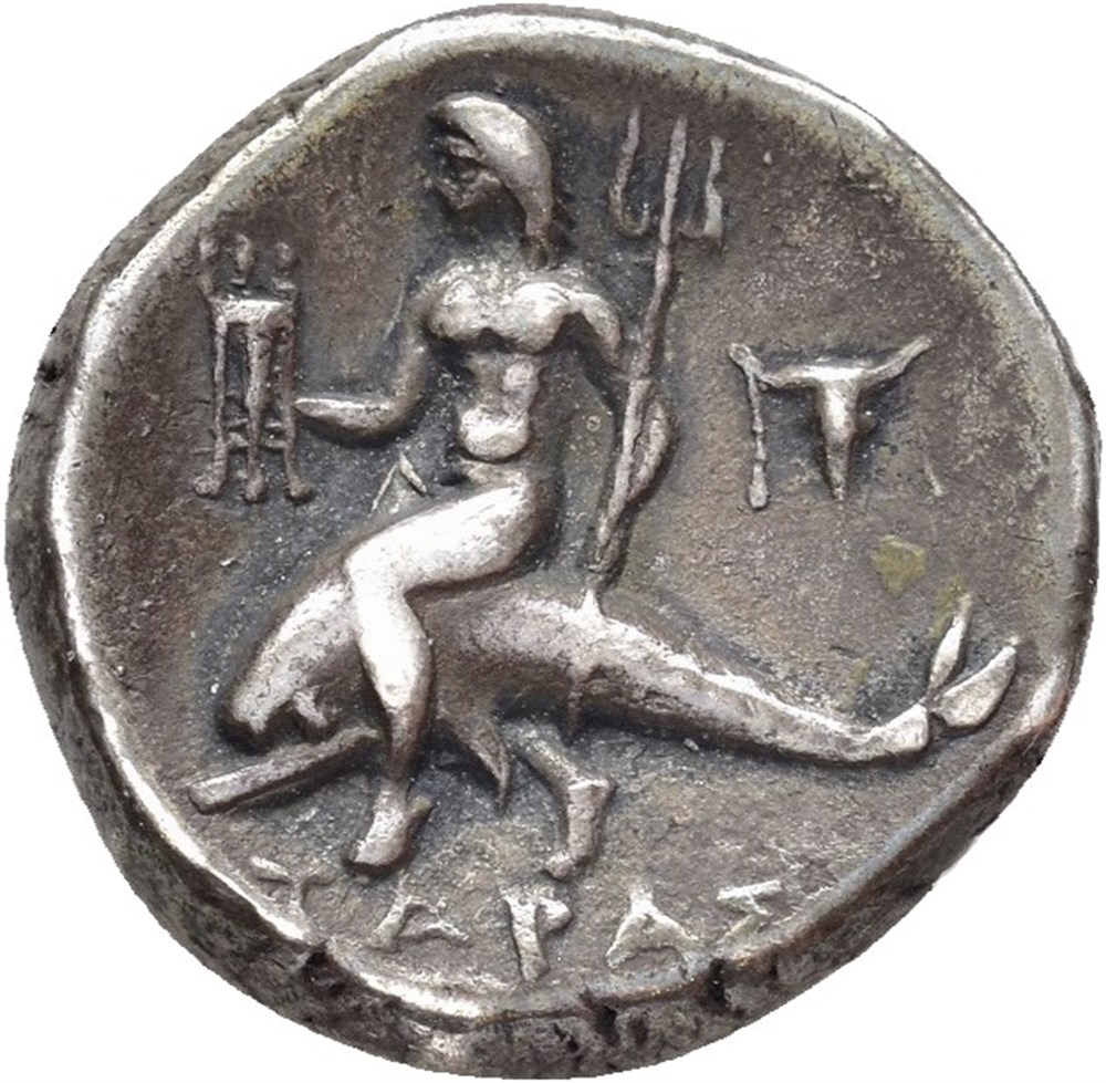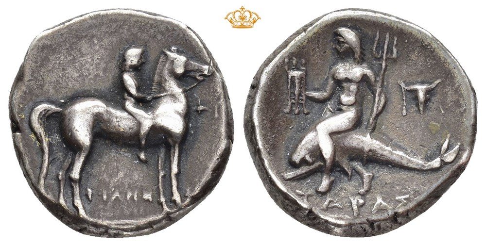 CALABRIA, Tarentum. AR Nomos (19 mm; 6.06 g). Struck circa 272-240 BC. Philemenos, magistrate. Obverse: ΦΙ /ΦΙΛΗΝΕ-ΝΟΣ, Youth on horse standing right. Reverse: TAPAΣ, Youthful Phalanthos, riding dolphin to left, holding a tripod in right hand and trident in his left; to right, filleted bucranion. Attractive deep old cabinet toning.