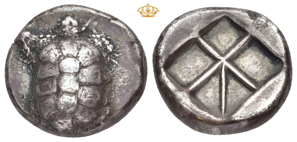 ISLANDS off ATTICA, Aegina. AR Stater (21 mm; 12,11 g). Struck circa 370 BC. Obverse: Land tortoise with segmented shell. Reverse: Incuse square with thin skew pattern. Some die rust on obverse. Deeply toned.