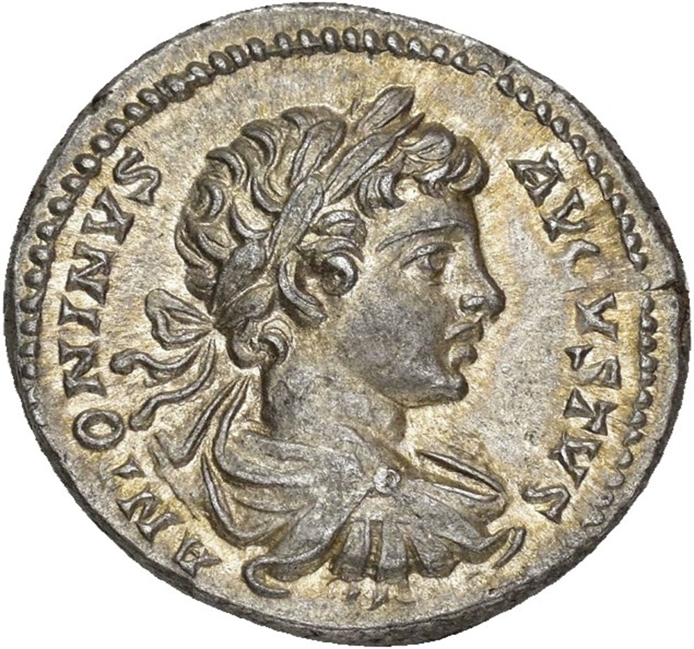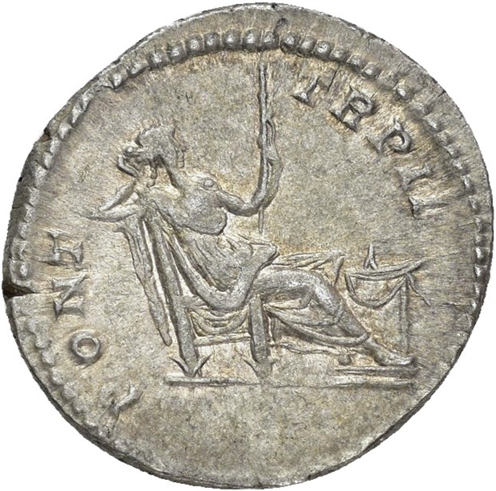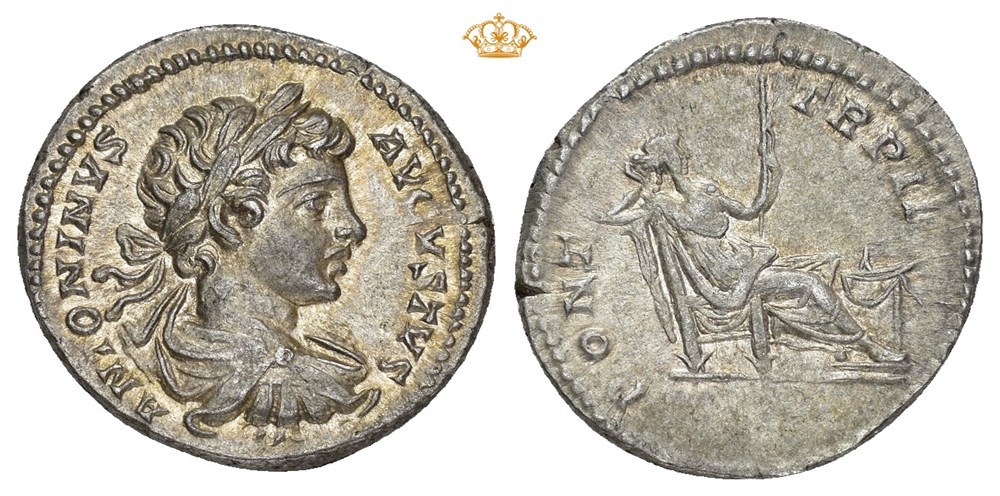 Caracalla 198-217 AD. AR Denarius (19 mm; 3.49 g). Rome mint, struck 199 AD. Obverse: ANTONINVS AVGVSTVS, Laureate, draped and cuirassed bust of Caracalla right. Reverse: PONT TR P II, Securitas seated right on low seat, resting her head in her right hand and holding a scepter in her left; an altar stands to the side. A wonderful portrait of Caracalla. Beautifully toned.