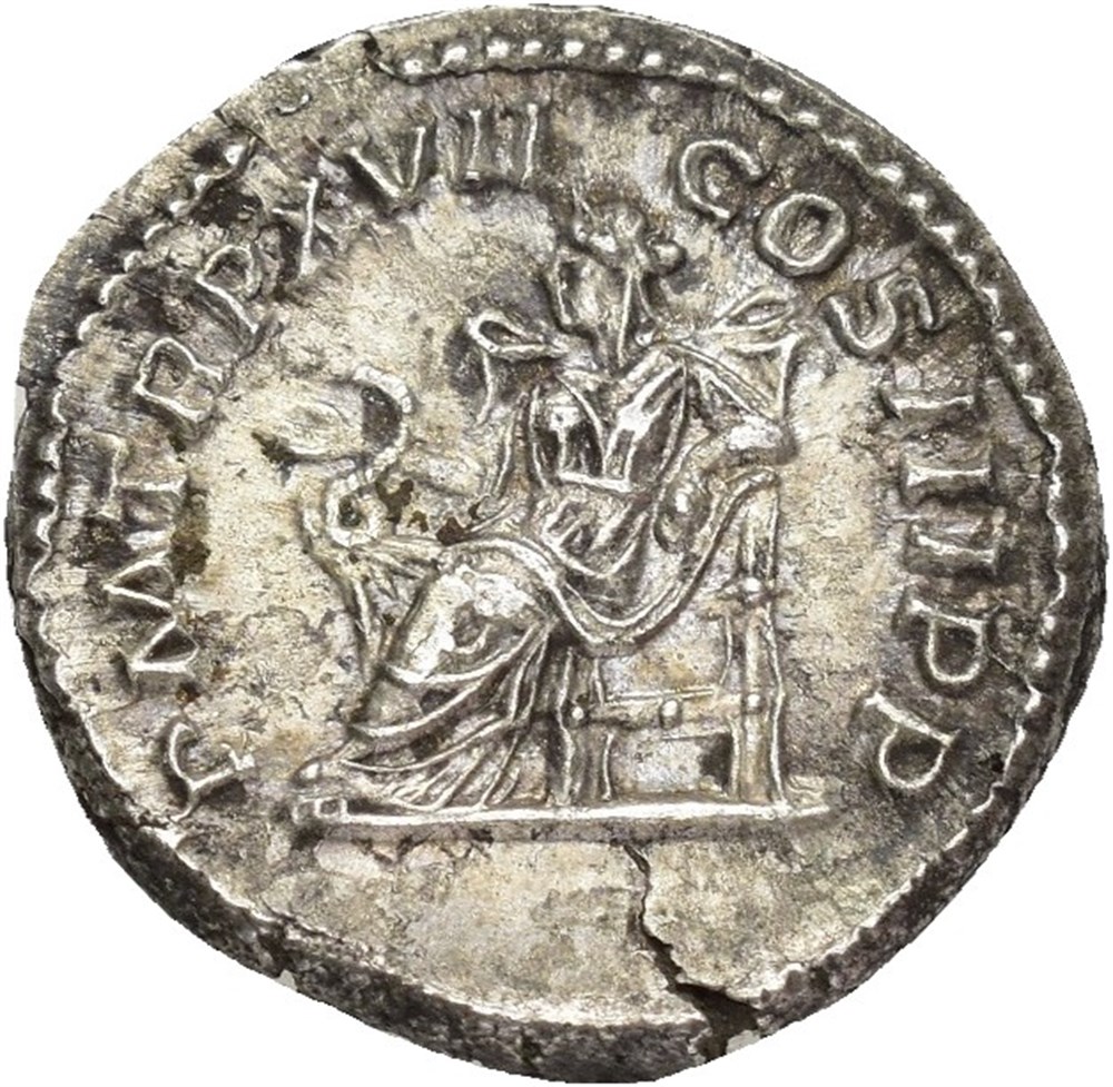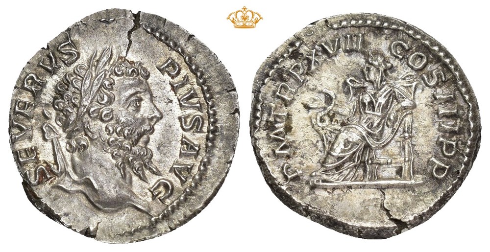 Septimus Severus 193-211 AD. AR Denarius (19 mm; 3.30 g). Rome mint, struck 209 AD. Obverse: SEVERVS PIVS AVG, Laureate head of Septimius Severus right. Reverse: P M TR P XVII COS III P P, Salus seated left, feeding a snake coiled on her lap from a patera held in her right hand. Small flan crack at 12 o'clock. Attractively toned.