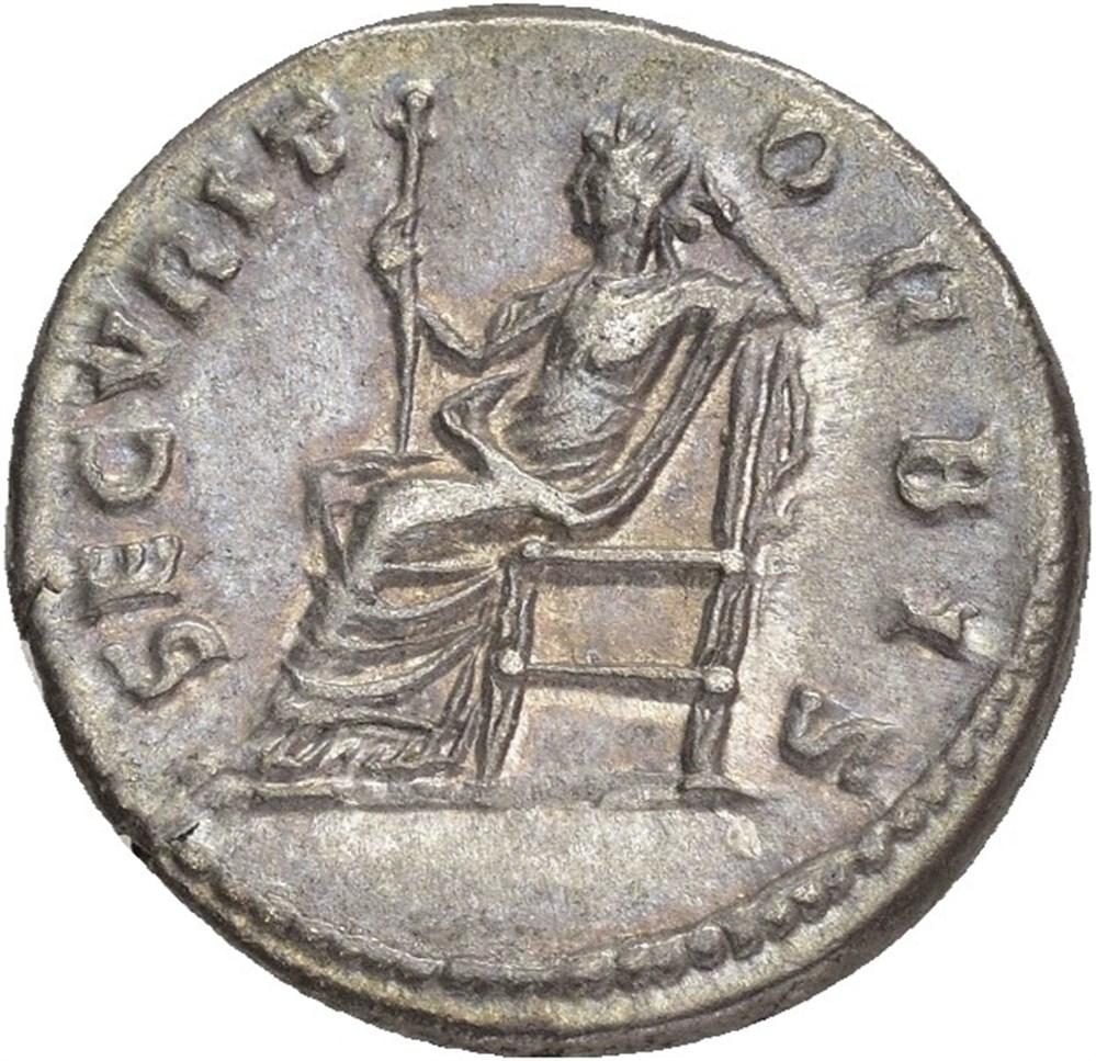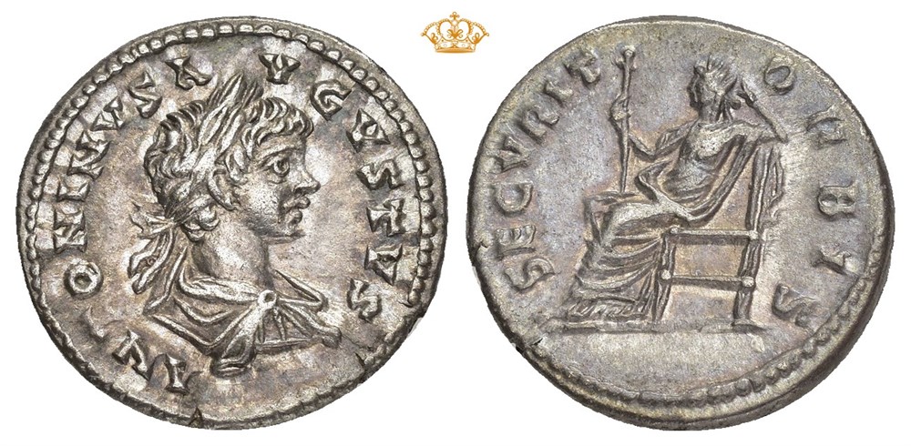 Caracalla 198-217 AD. AR Denarius (19 mm; 3.57 g). Laodicea ad Mare mint, struck circa 200-201 AD. Obverse: ANTONINVS AVGVSTVS, Laureate, draped and cuirassed bust of Caracalla right. Reverse: SECVRIT ORBIS, Securitas seated left, holding scepter in right hand and resting her head on her left. Attractively toned.