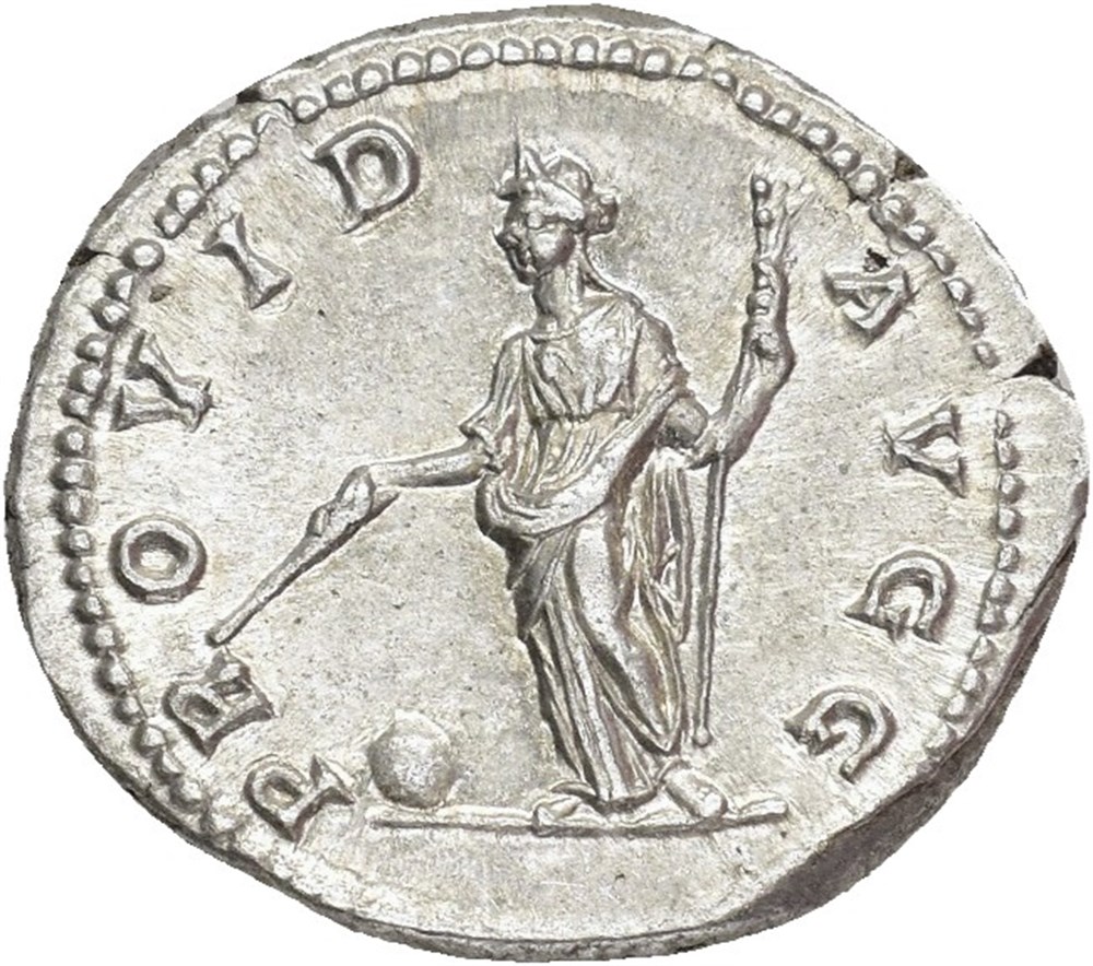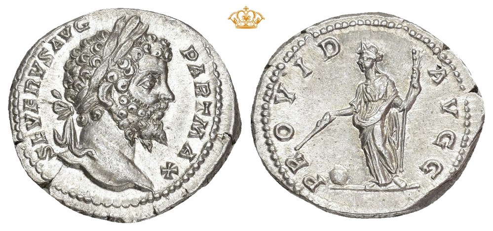 Septimius Severus 193-211 AD. AR Denarius (19 mm; 3.34 g). Rome mint, struck circa 200-201 AD. Obverse: SEVERVS AVG PART MAX, Laureate head of Septimius Severus right. Reverse: PROVID AVGG, Providentia standing left, holding a wand in her right hand over a globe set on the ground and a long scepter in left. An incredibly sharp and well struck coin with lustrous fields. Lightly toned.