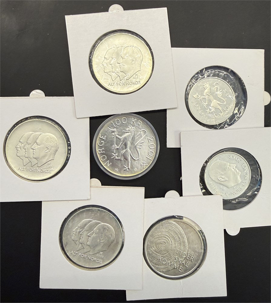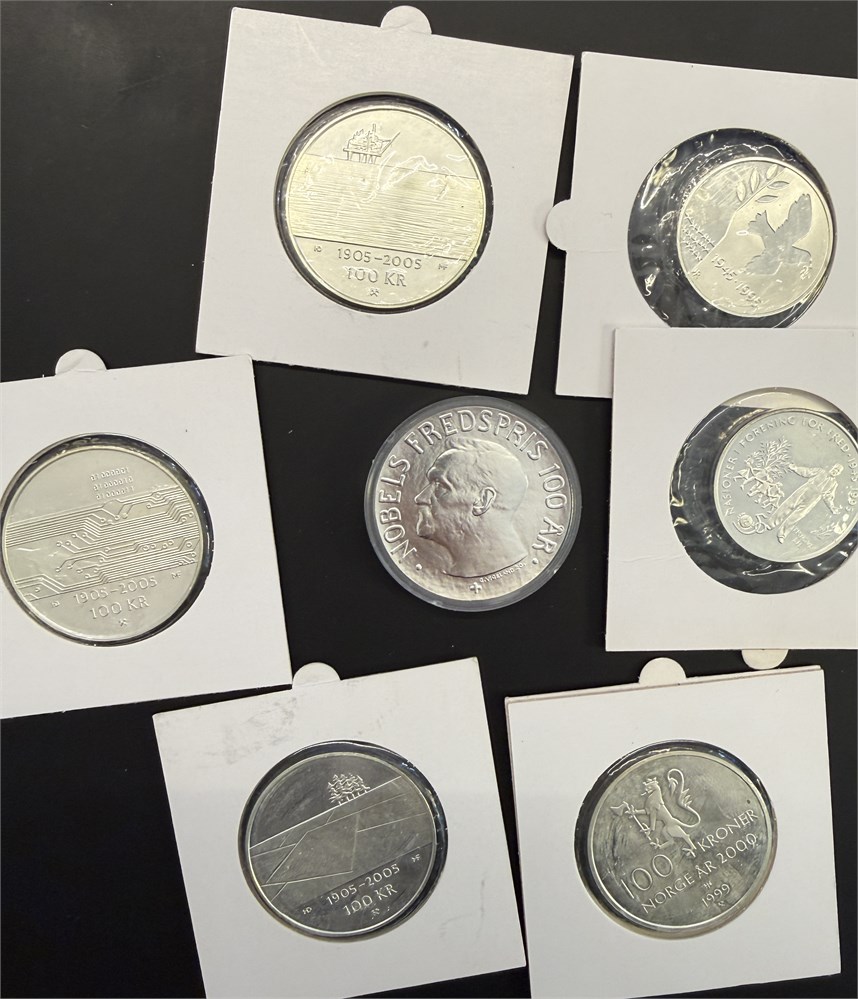 50 kr FN, 50 kr Frigjøringen, 100 kroner Tusenårsmynten, 100 kroner Nobel, 100 kroner 2003, 2004 og 2005.