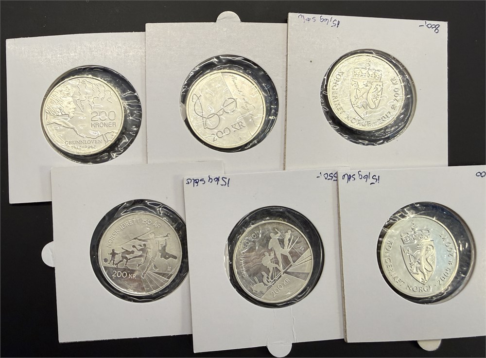 Seks stk 200 kroner, Hamsund, Ski-VM Oslo, Norsk Idrett 150 år, Harald og Sonja 75 år, Wergeland og Grunnloven, alle i Hartberger.