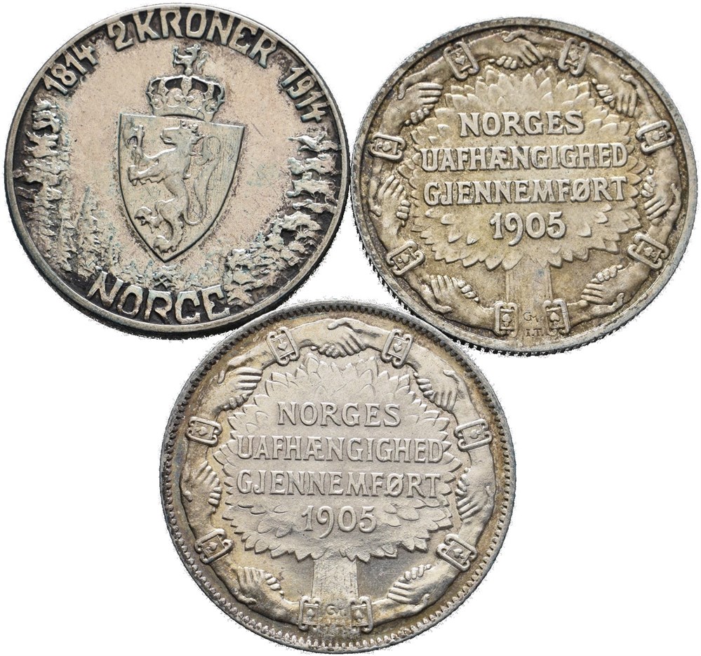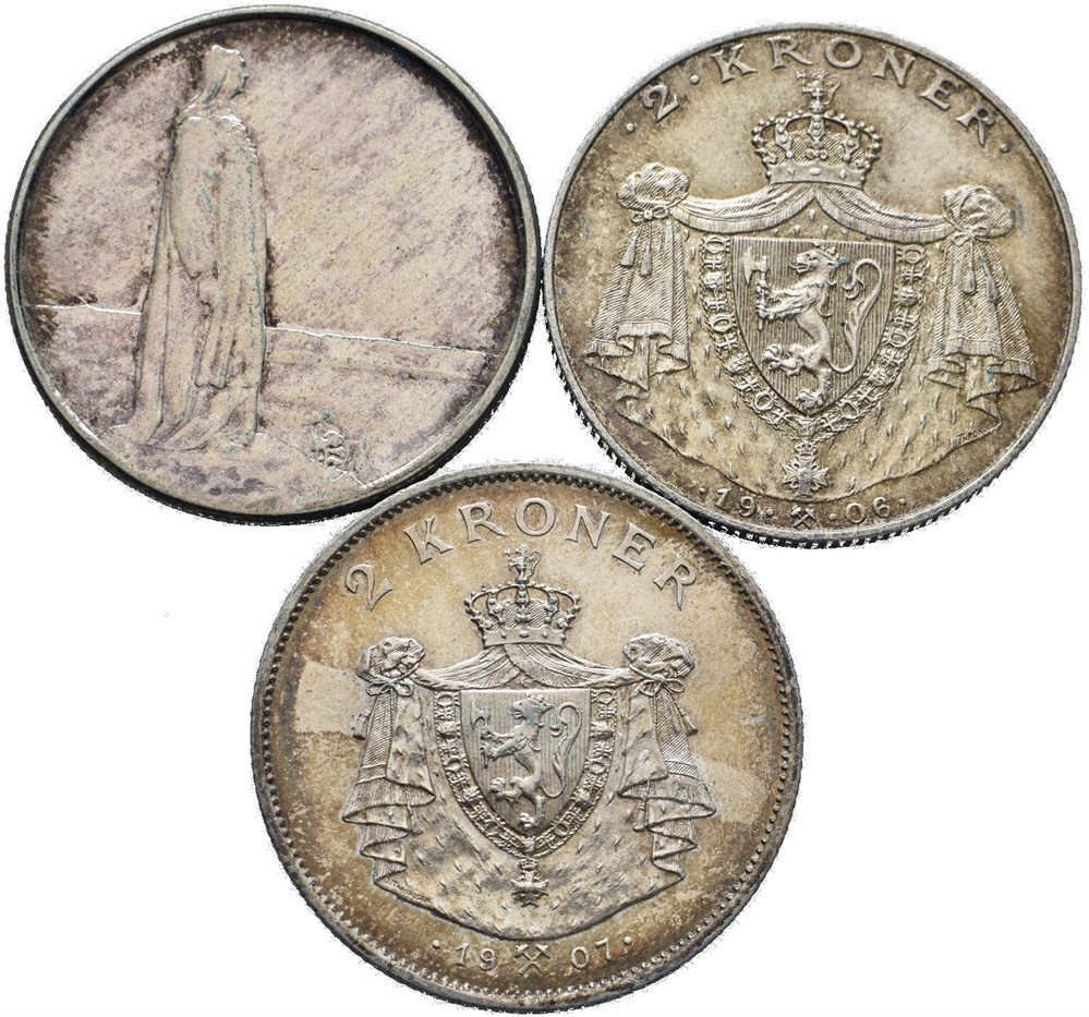 2 kroner jubileum 1906, 07 og 14, noe grønt irr, 1907 holder 0/01