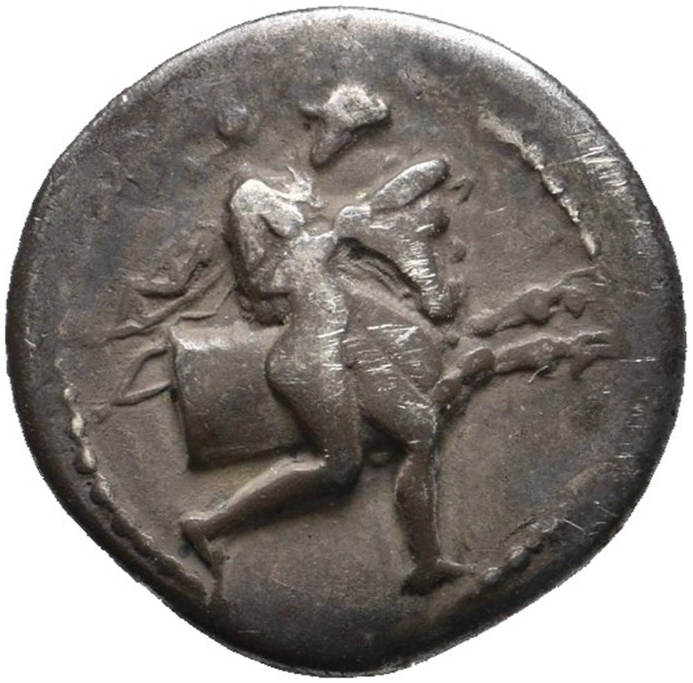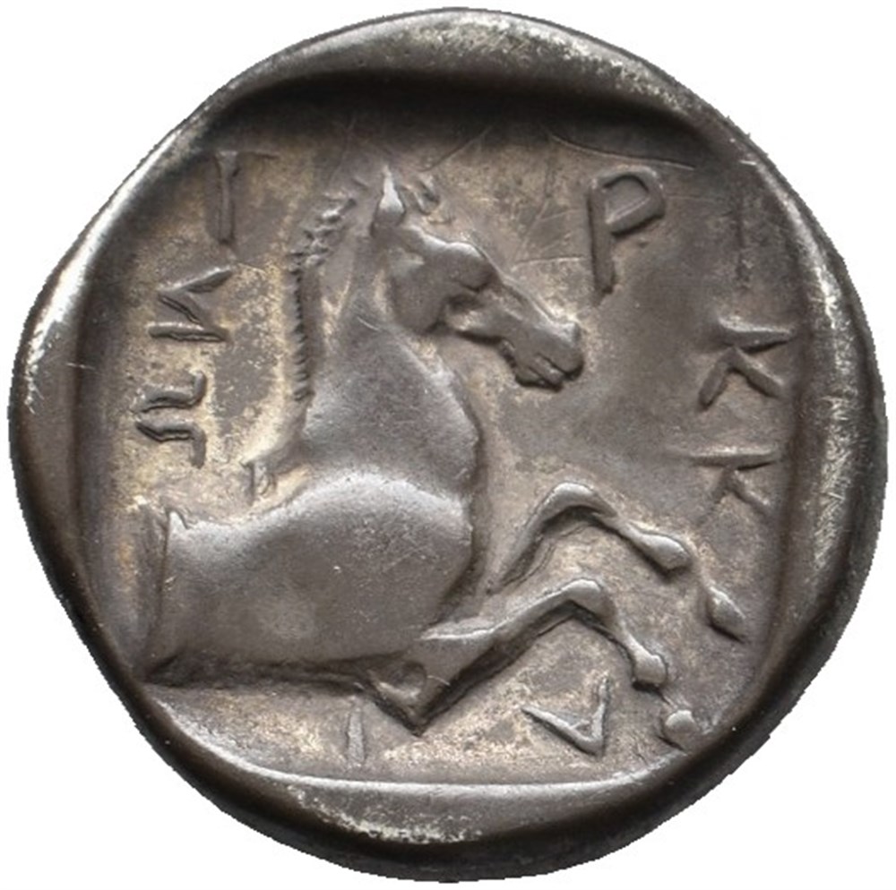 THESSALY, Trikka. Circa 400-440 BC. AR Hemidrachm (16.5 mm; 2.95 g). Thessalos, nude but for cloak and petasos hanging over his shoulder, head facing, holding a band below the horns of a bull leaping right / Τ - ΡΙ - ΚΚ - Α - Ι - ΩΝ (partially retrograde), Forepart of horse to right; all within incuse square. Obverse struck with a slightly worn die. A few small scratches on obverse. Deep iridescent old cabinet toning.